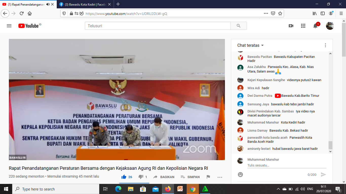 Kota Kediri. Kordiv PHL Bawaslu Kota Kediri mengikuti acara Penandatanganan Peraturan Bersama Ketua Bawaslu RI, Kapolri dan Jaksa Agung RI tentang Sentra Gakkumdu pada Pilkada serentak 2020 pada Senin, 20 Juli 2020 pukul 09.00 WIB melalui Youtube.Dalam sambutannya, Ketua Bawaslu RI, Abhan menyampaikan, Bawaslu multi fungsi dalam Pilkada, melakukan pengawasan dan pencegahan, melakukan penegakan hukum bersama Kepolisian dan Kejaksaan yang tergabung dalam Sentra Gakkumdu untuk menegakkan keadilan Pilkada. Hal ini, sesuai UU 10 Tahun 2016 tentang Pilkada yang disempurnakan dengan Perppu No. 2 Tahun 2020 tentang Pilkada di masa pandemi, bahwa pedoman pelaksanaan Sentra Gakkumdu harus berdasarkan Peraturan Bersama antara Bawaslu RI, Kepolisian Negara RI dan Kejaksaan Agung RI.Sementara itu Kapolri, Jendral Idham Aziz akan memberikan penghargaan kepada anggota Kepolisian yang tergabung dalam Gakkumdu, bahkan siap mensupervisi di beberapa daerah dalam tahapan Pilkada terhadap pelaksanaan Gakkumdu.Sementara itu, Jaksa Agung RI, Dr. H. ST Burhanuddin, SH, MM menyampaikan, Sentra Gakkumdu merupakan bentuk konkrit kerja sama Bawaslu, Kepolisian dan Kejaksaan dalam Pilkada sesuai dengan fungsi masing-masing, salah satunya untuk mengantisipasi terjadinya kampanye hitam, terlebih dalam bentuk SARA.