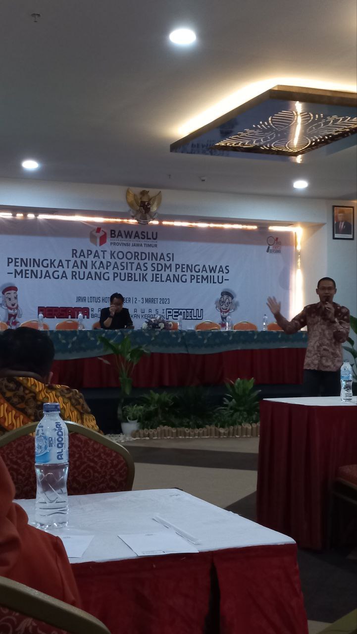 Jember, 2-3 Maret 2023. Bawaslu Kota Kediri menghadiri Rapat Koordinasi Peningkatan Kapasitas SDM Pengawas Menjaga Ruang Publik Jelang Pemilu yang dilaksanakan oleh Bawaslu Provinsi Jawa Timur di Java Lotus Hotel Jember.