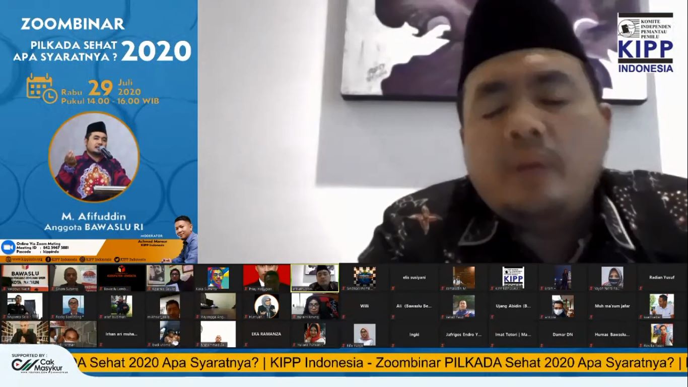 Kota Kediri. Komisi Independen Pemantau Pemilu (KIPP) menyelenggarakan diskusi publik secara daring dengan tema “Pilkada Sehat 2020, Apa Syaratnya?” pada Rabu, 29 Juli 2020 mulai pukul 14.00 WIB. Salah satu narasumber pada diskusi ini adalah Moch. Afifuddin, Anggota Bawaslu RI. Bawaslu Kota Kediri mengikuti diskusi ini melalui akun Youtube dari Cak Masykur (Tenaga Ahli Bawaslu RI).
