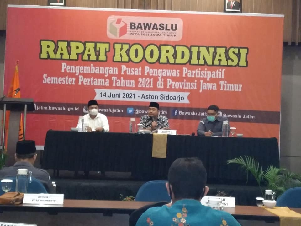Sidoarjo. Bawaslu Provinsi Jawa Timur mengundang Kordiv PHL Bawaslu Kabupaten/ Kota se-Jawa Timur dan beberapa pemantau Pemilu dalam Rapat Koordinasi Pengembangan Pusat Pengawasan Partisipatif Semester Pertama Tahun 2021 Provinsi Jawa Timur di Hotel Aston Sidoarjo pada 14 Juni 2021.Hadir dalam acara ini, Mohammad Afifuddin, Anggota Bawaslu Republik Indonesia dan Kordiv PHL Bawaslu Jawa Timur, Aang Kunaifi. Afif menyampaikan, saat ini sedang berlangsung konsinyering antara DPR, Bawaslu, KPU, sudah banyak kesepakatan yang dihasilkan, namun belum masuk pada keputusan. Kemungkinan tahapan Pemilu 2024 dimulai awal 2022, oleh karena itu sebelum itu Perkuat Pengawasan Partisipatif melalui program SKPP. Menurut Mansur, Kordiv PHL Bawaslu Kota Kediri, Kader SKPP di Bawaslu Kota Kediri masih tetap berhubungan baik, juga kita siap melaksanakan program itu lagi di masa yang akan datang.