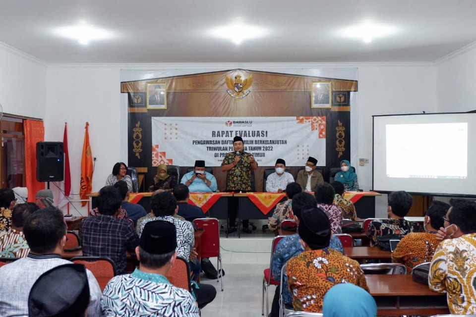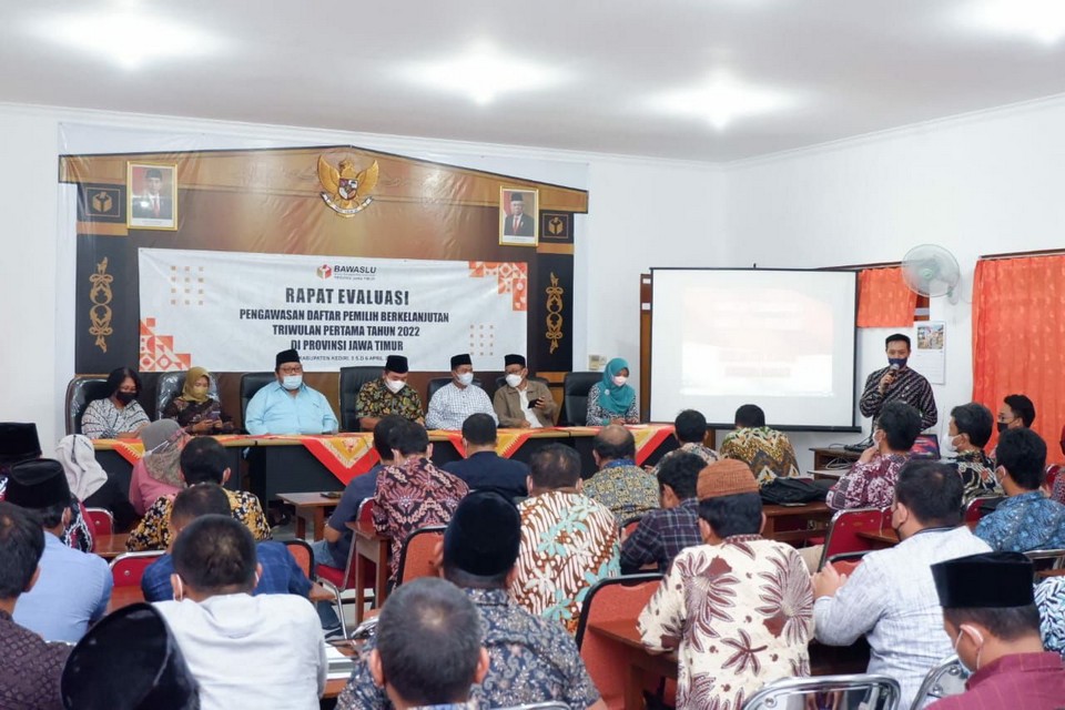 Kediri, 05 April 2022. Koordinator Divisi PHL Bawaslu Kota Kediri menghadiri undangan Rapat Evaluasi Pemutakhiran Daftar Pemilih Berkelanjutan Triwulan I di Kantor Bawaslu Kediri yang diikuti oleh 38 Kordiv PHL Bawaslu Kabupaten/Kota se-Jawa Timur. Kegiatan ini dihadiri oleh Ketua Bawaslu Provinsi Jawa Timur, Moh. Amin beserta Anggota yakni Nur Elya Anggraini, Eka Rahmawati, Aang Kunaifi dan Muh. Ikhwanudin Alfianto. M. Afifuddin selaku Anggota Bawaslu RI sekaligus Calon Anggota KPU RI membuka kegiatan ini dan melaksanakan pisah kenang yang akan dilantik pada tanggal 11 April 2022 mendatang.