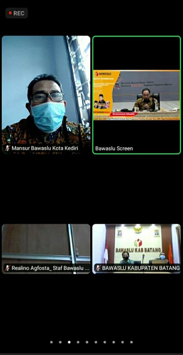 Kota Kediri, 11 Februari 2021. Bawaslu Kota Kediri mengikuti Rapat Koordinasi Evaluasi Hasil Pengawasan Pemilihan Serentak Tahun 2020 yang dilaksanakan oleh Bawaslu RI melalui daring. Acara ini diikuti oleh Bawaslu kabupaten/kota maupun Bawaslu Provinsi seluruh Indonesia yang dimulai pukul 10.00 WIB.