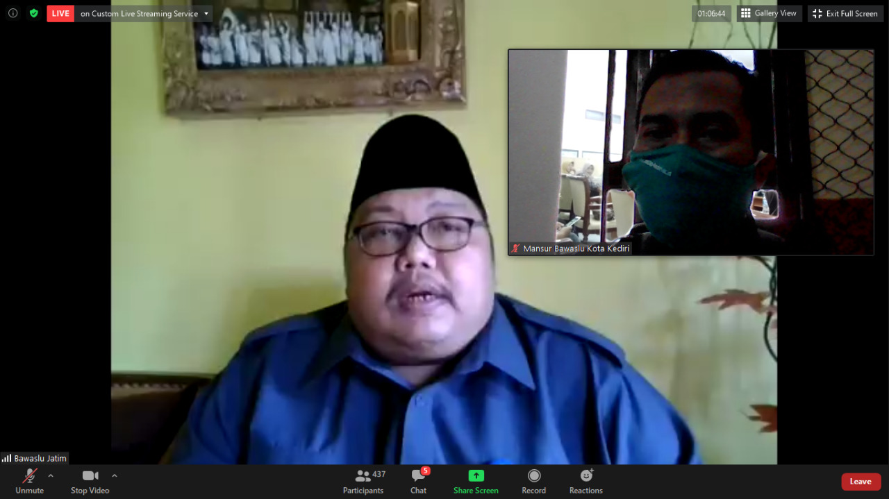 Kota Kediri, 27 Juli 2020. Moh. Amin, Ketua Bawaslu Provinsi Jawa Timur membuka acara diskusi daring dengan tema “Tips dan Trik Sehat Mengawasi Pilada” sekaligus memberikan arahan tentang perlunya menjaga kesehatan selama pandemi terlebih yang melakukan tahapan Pilkada 2020. Acara ini dilaksanakan oleh Bawaslu Provinsi Jawa Timur dan diikuti oleh Bawaslu se-Jawa Timur baik Kabupaten/Kota maupun di tingkat kecamatan serta kelurahan. Dalam arahannya beliau menjelaskan bahwa Pilkada dilaksanakan pada bulan Desember 2020 yang terjadi ditengah pandemi Covid 19. Oleh karena itu, diharapkan seluruh masyarakat terutama komponen yang terlibat langsung dalam Pilkada 2020 dalam keadaan sehat dengan menjalankan protokol kesehatan Covid 19. Bawaslu sadar bahwa hukum tertinggi adalah kesehatan rakyat.