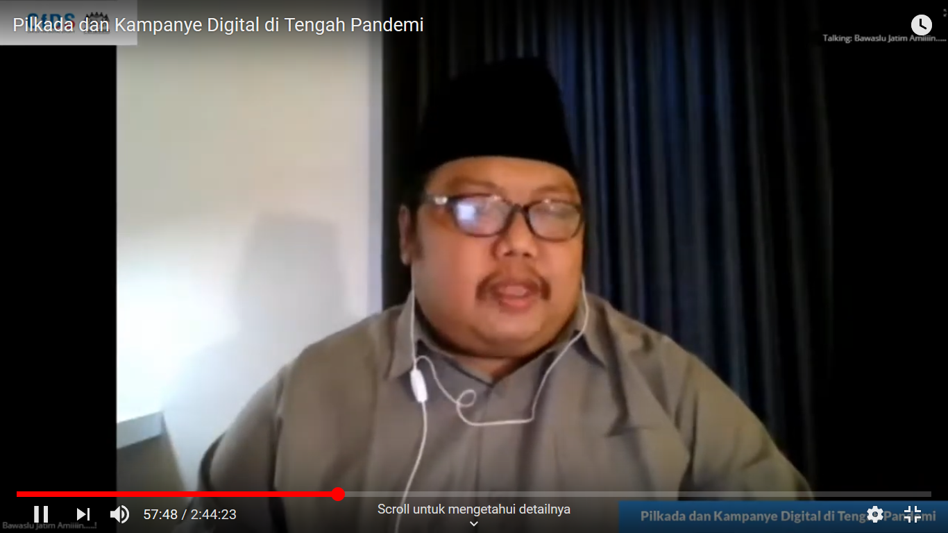 Kota Kediri. Dalam PERBAWASLU NO. 12 TAHUN 2018 tentang Pengawasan Kampanye Pilkada disebutkan Bawaslu mengawasi kampanye di media sosial, baik akun yang didaftarkan maupun yang tidak didaftarkan. Pengawasan kampanye di medsos, khususnya konten atau isi kampanye, melanggar ketentuan apa tidak, ada ujaran kebencian, hoax atau penghinaan SARA apa tidak? Penanganan pelanggaran pada akun medsos yang terdaftar ke KPU melalui mekanisme resmi, kalau tidak terdaftar penanganannya bekerja sama dengan pihak lain.Hal ini disampaikan oleh Muhammad Amin, Ketua Bawaslu Jawa Timur dalam Webinar Daring: Pilkada dan Kampanye Digital di Tengah Pandemi yang diselenggarakan oleh Center for Digital Society (CfDS) UGM, 28 Agustus 2020. Bawaslu Kota Kediri mengikuti dari Youtube.Amin juga menambahkan, medsos itu ibarat senjata, tergantung siapa yang menggunakan dan untuk apa digunakannya, positif apa negatif. Peran Bawaslu mengawasi penggunaan medsos oleh peserta Pilkada dan menangani dugaan pelanggaran yang dilakukan dalam medsos, baik nanti pelanggaran administratif hingga pidana.