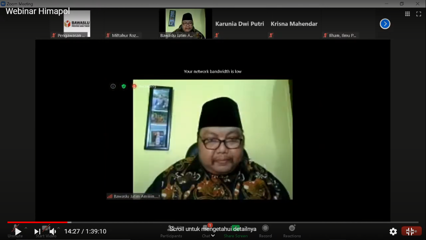 Hal tersebut di atas disampaikan oleh Muhammad Amin, Ketua Bawaslu Jawa Timur saat menjadi narasumber di Webinar Himpunan Mahasiswa Ilmu Politik Universitas Islam Negeri Sunan Ampel Surabaya pada 13 Agustus 2020 mulai pukul 19.00 dengan tema Menuju Pilkada Serentak 2020 : Inovasi dalam Tantangan Penyelenggaraan Pilkada oleh KPU dan Bawaslu di Masa Pandemi. Bawaslu Kota Kediri mengikuti acara ini melalui Youtube.