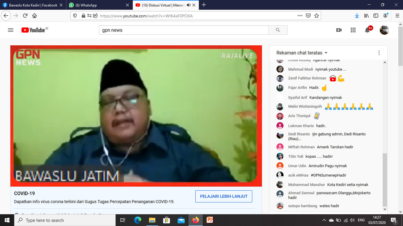 Kota Kediri. DPD Gerakan Pemuda Nusantara Jawa Timur menyelenggarakan Webinar Daring dengan tema "Meneropong Kesiapan Penyelenggaraan Dalam Rangka Pilkada Serentak di 19 Daerah Jawa Timur 9 Desember 2020 Ditengah Pandemi Covid 19” pada 2 Juli 2020 mulai pukul 19.00 WIB. Narasumber yang dihadirkan ada Ketua Bawaslu Jawa Timur, Muhammad Amin dan Ketua KPU Jawa Timur, Choirul Anam. Kordiv PHL Bawaslu Kota Kediri mengikuti acara ini dari Youtube secara live.Amin menyampaikan, Bawaslu wajib melakukan pengawasan tahapan Pilkada saat ini meskipun belum ada biaya dan harus mengikuti protokol kesehatan, bahkan pengawas pemilihan harus memberi contoh dalam menggunakan masker dan alat protokol kesehatan lainnya dalam setiap aktifitasnya. Bawaslu juga sedang fokus melakukan pengawasan dan pencegahan agar partisipasi masyarakat tidak menurun Pilkada ini.Sedangkan Anam menyampaikan, KPU beberapa Kabupaten/ Kota di Jawa Timur juga mulai melakukan verifikasi faktual untuk dukungan bakal calon perseorangan Kepala Daerah, meskipun anggaran belum maksimal.