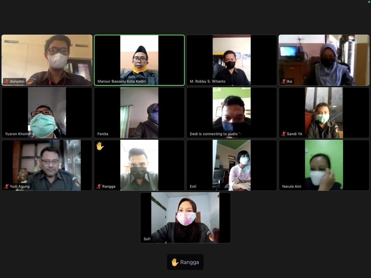 Kota Kediri, 05 Juli 2021. Bawaslu Kota Kediri melaksanakan apel rutin setiap hari Senin yang dilakukan secara virtual. Apel ini dimulai pukul 09.00 WIB sampai selesai. Apel in diikuti oleh seluruh jajaran Kordiv dan seluruh jajaran Sekretariat baik dari Koordinator Sekretariat maupun dari Staf. Hal ini adalah bentuk kegiatan dalam rangka mendukung adanya PPKM Darurat se-Jawa Bali yang dimulai sejak tanggal 03 Juli sampai 20 Juli 2021. Dengan demikian, diharapkan penyebaran Virus Covid 19 bisa berkurang.