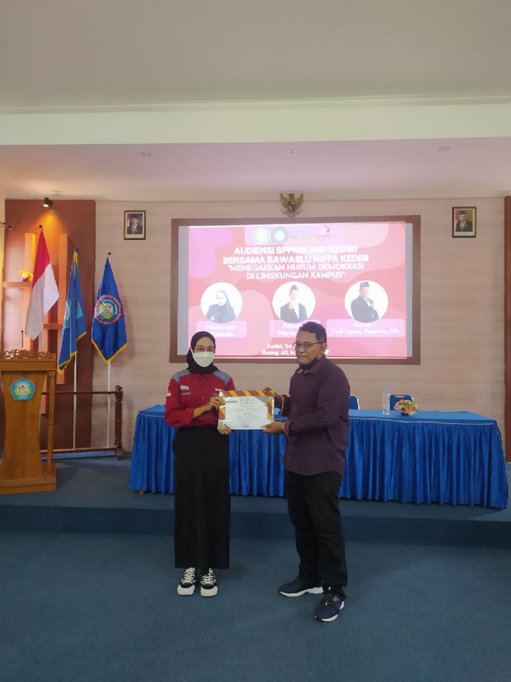 Kota Kediri, 24 Maret 2022. BPPRM UNP melaksanakan Audiensi bersama Bawaslu Kota Kediri yang dilaksanakan di Ruang A5 Kampus 1 UNP pada pukul 09.00 WIB yang diikuti oleh seluruh pengurus dan anggota BPPRM sekaligus perwakilan dari KPRM dan beberapa tamu undangan lain. Kegiatan ini turut dihadiri oleh Pembina BPPRM, Nursalim, S.Pd., MH. Tema yang diambil dalam audiensi kali ini yakni "Menegakkan Demokrasi di Lingkungan Kampus". Dalam Audiensi ini, Mansur selaku Kordiv PHL dan Yudi Agung Nugraha selaku Kordiv HPP-PS Bawaslu Kota Kediri memberikan materi-materi tentang pengawasan dan penanganan pelanggaran Pemilu maupun Pilkada.