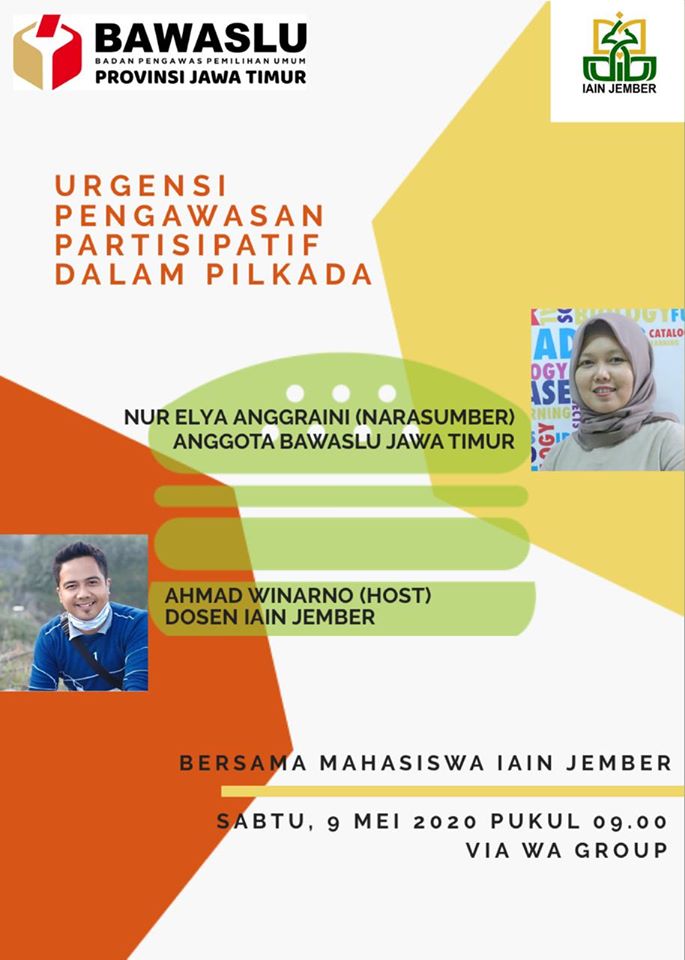 Kota Kediri. Kordiv PHL Bawaslu Kota Kediri ikut join dengan Zoom Meeting dalam mengikuti acara Bawaslu Jatim Goes to Campus. Kali ini bersama IAIN Jember yang dilaksanakan pada hari Sabtu, 9 Mei 2020. Sebagai host, Ahmad Winarno, dosen IAIN Jember dengan narasumber Nur Eliya Anggraeni, Anggota Bawaslu Jatim.