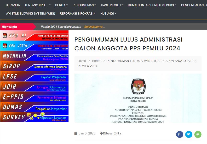 Berdasarkan Pengumuman KPU Kota Kediri Nomor : 04/PP.04.1-Pu/3571/2023 tanggal 3 Januari 2023 KPU Kota Kediri telah mengumumkan Hasil Seleksi Administrasi Panitia Pemungutan Suara untuk Pemilu tahun 2024.