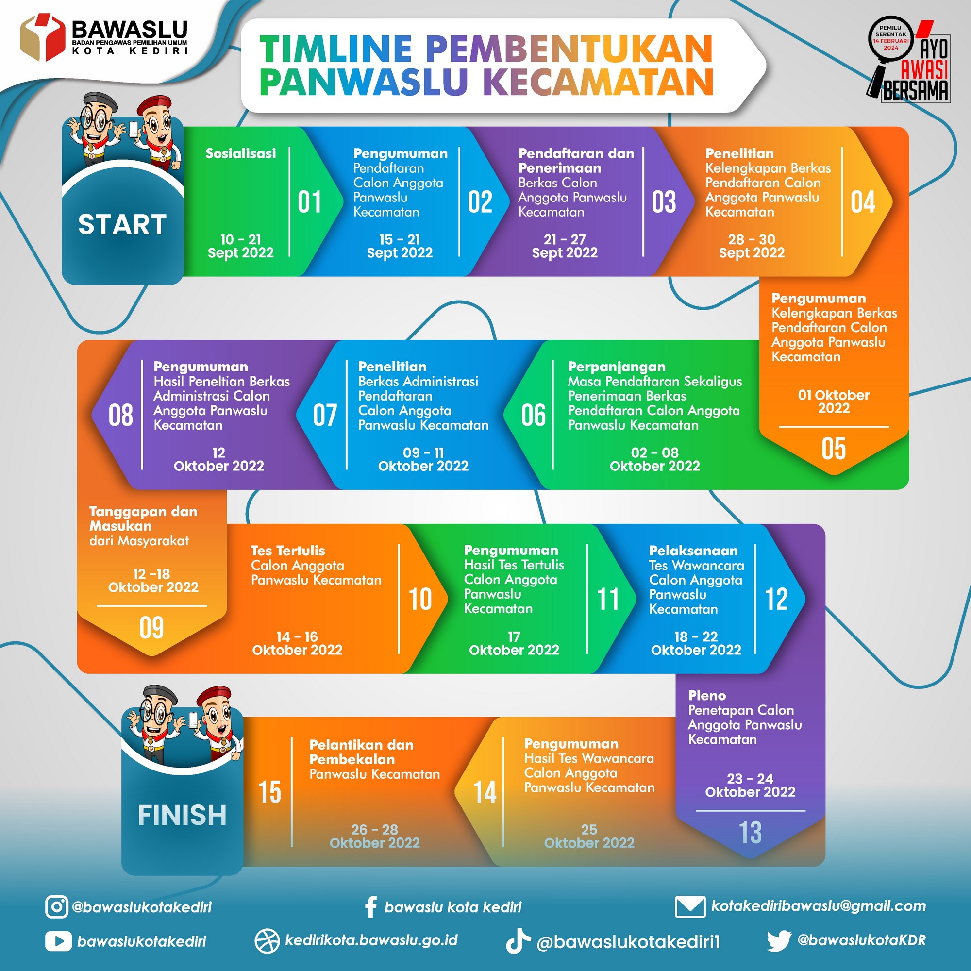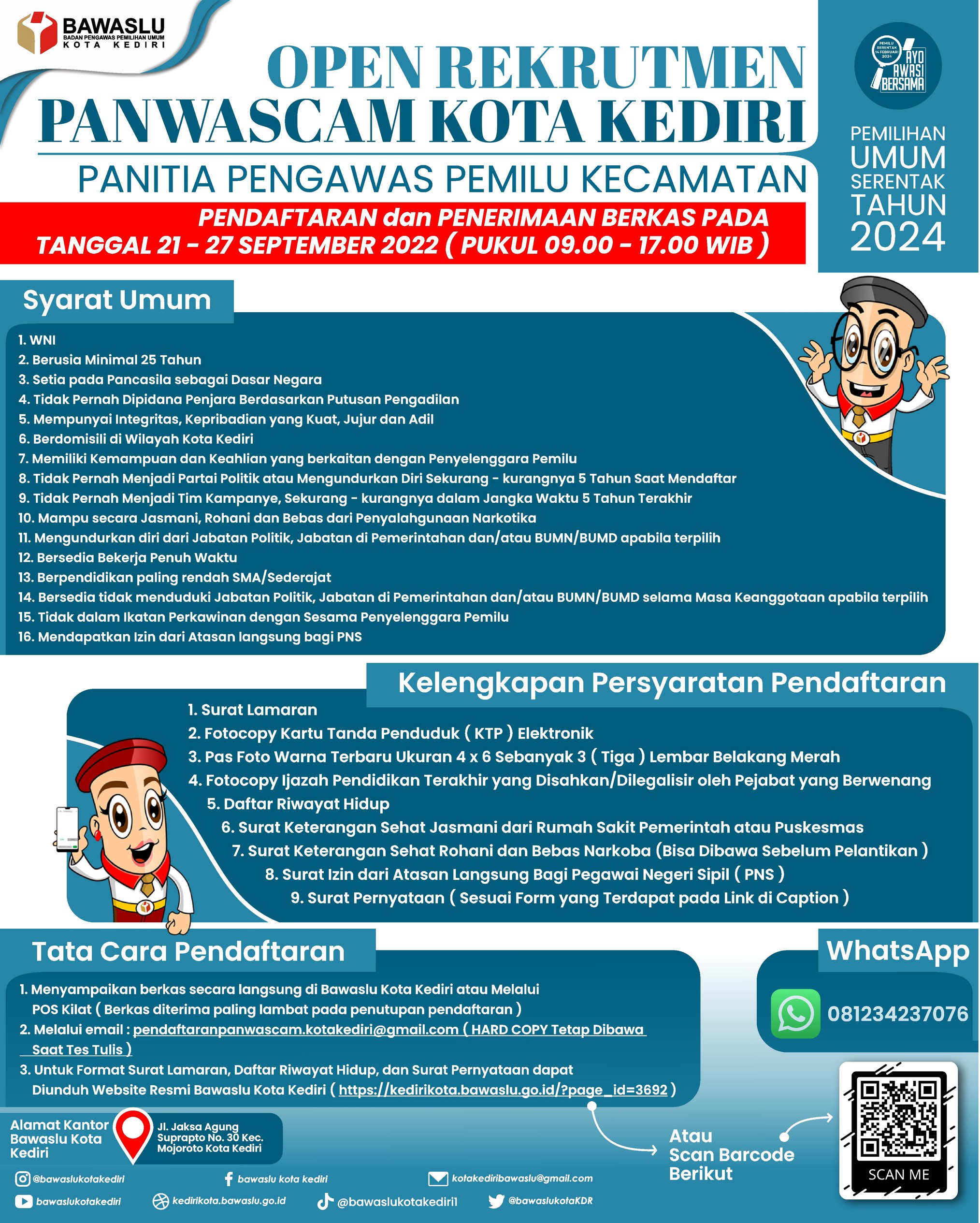 Hallo Sahabat Bawaslu khususnya di wilayah Kota Kediri. Bawaslu Kota Kediri membuka Pendaftaran Panwaslu Kecamatan se-Kota Kediri. Pendaftaran di mulai pada tanggal 21 sampai 27 September 2022. Informasi lebih lanjut bisa kunjugi Laman Informasi Website Resmi Bawaslu Kota Kediri (https://kedirikota.bawaslu.go.id/?page_id=3692)