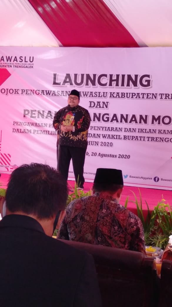 Trenggalek. Ketua dan Anggota Bawaslu Kota Kediri mengikuti acara Launching Pojok Pengawasan Bawaslu Trenggalek (20/8/2020) di Kantor Bawaslu Kabupaten Trenggalek. Acara ini juga diikuti oleh Ketua dan Anggota Bawaslu Jawa Timur serta Bawaslu Kabupaten/ Kota sekitar Trenggalek.Ketua Bawaslu Jawa Timur, Muhammad Amin dalam sambutannya menyampaikan, pojok pengawasan merupakan terminal untuk memperoleh informasi dan ilmu pengawasan Pemilu bagi masyarakat, perlunya pojok Pengawasan, karena bawaslu tidak bisa bekerja dalam pengawasan sendiri, perlu partisipasi masyarakat seluas-luasnya, maka masyarakat perlu banyak mengetahui informasi tentang Pengawasan Pemilu agar dapat membantu pengawasan dalam bentuk pengawasan partisipatif.