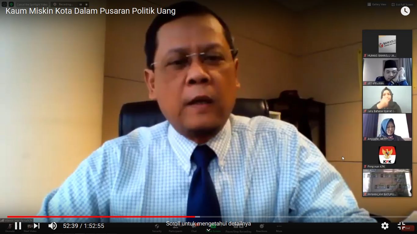 Kota Kediri. Direktur Penelitian dan Pengembangan KPK, Wawan Wardiana menjadi salah satu yang memaparkan materi pada diskusi publik secara daring dengan tema "KAUM MISKIN KOTA DALAM PUSARAN POLITIK UANG" pada 8 Juli 2020 mulai pukul 10.00 WIB yang diselenggarakan oleh Bawaslu Jawa Timur.