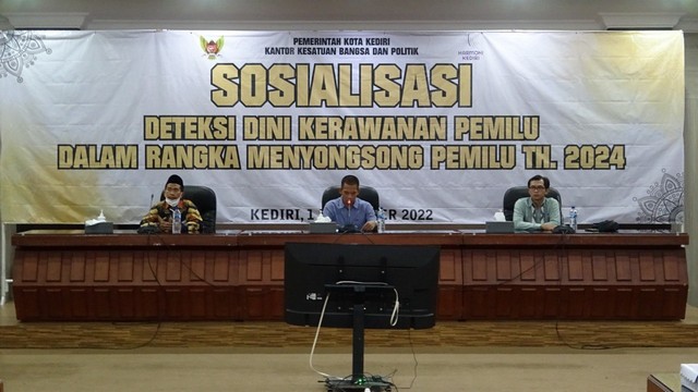Kota Kediri, 01 Desember 2022. Mansur, Ketua Bawaslu Kota Kediri menjadi narasumber dalam giat sosialisasi Deteksi Dini Kerawanan pemilu dalam Rangka Menyongsong Pemilu 2024 oleh Kesbangpol Kota Kediri.