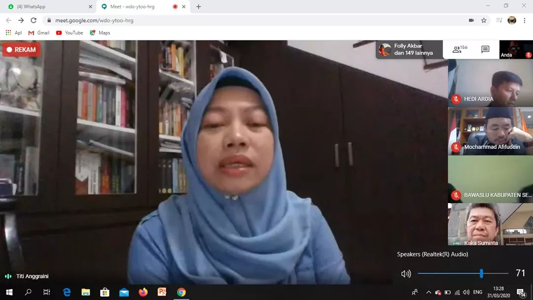 Afifudin yang membuka diskusi ini menyampaikan bahwa saat ini pengawas pemilu tidak melakukan pengawasan terhadap tahapan Pilkada 2020, tetapi harus melakukan pengawasan penundaan tahapan oleh KPU, karena fokus melakukan pencegahan tersebarnya covid-19, tetapi yang sedang proses sengketa tetap melanjutkan penyelesainnya tetapi ada yang dihentikan karena keamanan.