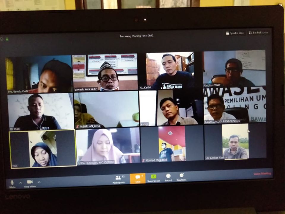 Kota Kediri. Kreativitas dari Koordinator Divisi Pengawasan Bawaslu Kabupaten/ Kota se-Jawa Timur selalu ada. Kali ini melakukan video conference secara mandiri tanpa didampingi Bawaslu Provinsi. Vidcon ini merupakan rapat perdana dari Kordiv Pengawasan Bawaslu se-Jatim yang dilaksanakan pada hari Jumat, 17-4-2020 dari kantor/ rumah masing-masing. Sebagai admin dari vidcon ini adalah Yogi, Kordiv Pengawasan Bawaslu Kota Batu. Ide vidcon ini diawali dari video call grup dari aplikasi WA yang dilakukan oleh Endro (Tulung Agung), Mansur (Kota Kediri), Azam (Kota Probolinggo), Fathur (Nganjuk) dan Ali (Kediri) sehari sebelumnya.