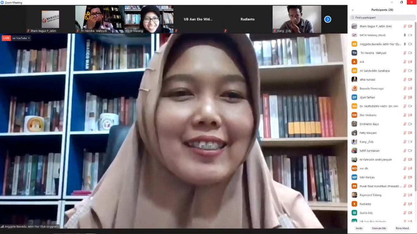 Hal ini disampaikan oleh Nur Elya Anggraeni dalam acara diskusi daring yang diselenggarakan oleh Forum Masyarakat Sipil Malang Raya dengan tema: "Menelisik Peluang dan Tantangan Calon Independen dalam Pilkada" pada Senin, 14 September 2020 mulai pukul 14.00 WIB. Bawaslu Kota Kediri mengikuti dari Youtube.