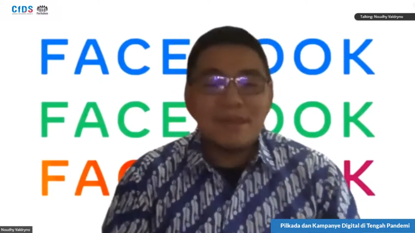 Kota Kediri. Center for Digital Society (CfDS) UGM bekerja sama dengan Perludem menyelenggarakan Webinar Daring dengan tema "Pilkada dan Kampanye Digital di Tengah Pandemi", Jumat, 28 Agustus 2020. Bawaslu Kota Kediri mengikuti dari Youtube. Salah satu pemateri dalam webinar ini, Noudhy Valdryno, Manajer Politik dan Hubungan Pemerintah Facebook.Ryno, panggilan akrab Valdryno menyampaikan, Facebook di Indonesia sudah banyak membantu perkembangan ekonomi, sosial hingga politik. 97 % Pemerintahan di dunia sudah memiliki eksistensi resmi di Facebook dengan 109 Kepala Negara, 86 Perdana Menteri dan 72 Menteri Luar Negeri.Sedangkan untuk Pilkada 2020 ini, Facebook sudah siap untuk berpartisipasi membantu KPU dan Bawaslu, khususnya meningkatkan partisipasi pemilih, juga dalam kampanye, baik periklanan hingga kampanye dengan akun-akun tertentu, bahkan dapat membantu pencegahan pelanggaran, mulai dari isu SARA, hate speech, hoax dan semacamnya. Termasuk konten negatif yang berbahasa Jawa sudah dapat dideteksi oleh Facebook.