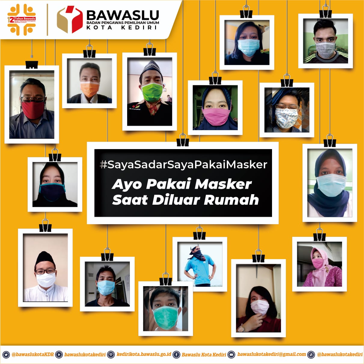 Kota kediri. Bawaslu kota kediri mencanangkan gerakan ayo memakai masker saat di luar rumah, yang bertujuan mengajak masyarakat u memakai masker saat di luar rumah guna mencegah dan memproteksi diri dari penularan virus corona