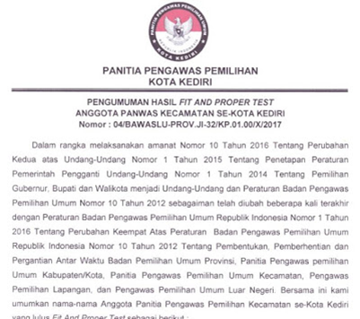 1. PENGUMUMAN HASIL FIT AND PROPER TEST ANGGOTA PANITIA PENGAWAS KECAMATAN SE-KOTA KEDIRI