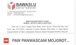 Pada hari ini Senin, tanggal Enam Belas, bulan Januari, Tahun Dua Ribu Dua Puluh Tiga (16-01-2023), bertempat di Kantor Bawaslu Kota Kediri, Jl. Jaksa Agung Suprapto Nomor 30 Kediri, berdasarkan Peraturan Badan Pengawas Pemilihan Republik Indonesia Nomor 19 Tahun 2017 sebagaimana diubah terakhir dengan Peraturan Badan Pengawas Pemilihan Umum Republik Indonesia Nomor 8 Tahun 2019, Kelompok Kerja Pembentukan Panwaslu Kecamatan Kota Kediri melakukan verifikasi dan klarifikasi terhadap Calon Pengganti Antar Waktu Anggota Panwaslu Kecamatan Mojoroto.
