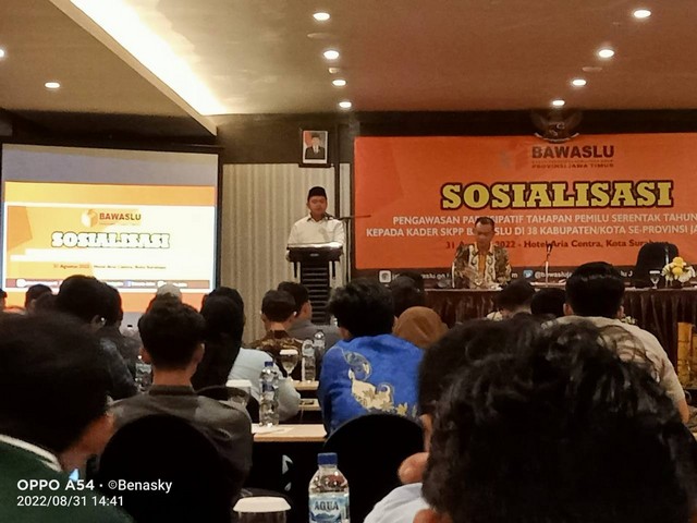 Surabaya, 31 Agustus 2022. Bawaslu Provinsi Jawa Timur mengkonsolidasi kesiapan Kader SKPP se-Jawa Timur dalam rangka ikut mengawasi tahapan pemilu 2024 melalui giat Sosialisasi Pengawasan Partisipatif Tahapan Pemilu Serentak Tahun 2024 Kepada Kader SKPP Bawaslu di 38 Kabupaten/Kota se-Provinsi Jawa Timur yang diadakan di dua tempat dimana, Kordiv PHL Bawaslu menghadiri acara di Kantor Bawaslu Provinsi Jawa Timur sedangkan untuk Kader SKPP menghadiri acara di Hotel Aria Centra Surabaya.