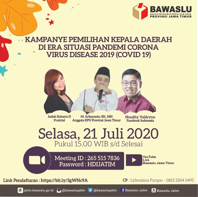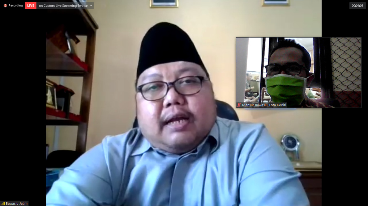 Kota Kediri. Mansur, S.T. selaku Ketua Bawaslu Kota Kediri sekaligus Koordinator Divisi Pengawasan Hubungan Masyarakat dan Hubungan Antar Lembaga bersama Yudi Agung Nugraha, S.H. selaku Koordinator Divisi Hukum Penanganan Pelanggaran Dan Penyelesaian Sengketa telah mengikuti kegiatan WEBINAR via ZOOM MEETING yang bertema “Kampanye Pemilihan Kepala Daerah di Era Situasi Pandemi Corona Virus Disease 2019 (COVID-19)”, yang dimulai pada hari Selasa, 21 Juli 2020 pukul 15.00 WIB. Dalam kegiatan ini hadir sebagai nasumber yaitu Indah Rahayu D. sebagai Praktisi, M. Arbayanto, SH, MH. Selaku Anggota KPU Provinsi Jawa Timur dan Noudhy Valdryno dari Facebook Indonesia. Perbincangan kali ini Noudhy Valdryno mengatakan bahwa pandemic merubah perilaku manusia di social media dan video group calls 70% digunakan 2x dalam seminggu oleh masyarakat pada saat ini dan Noudhy juga memberikan rekomendasi kebijakan Regulasi Pemilu dan Pilkada.