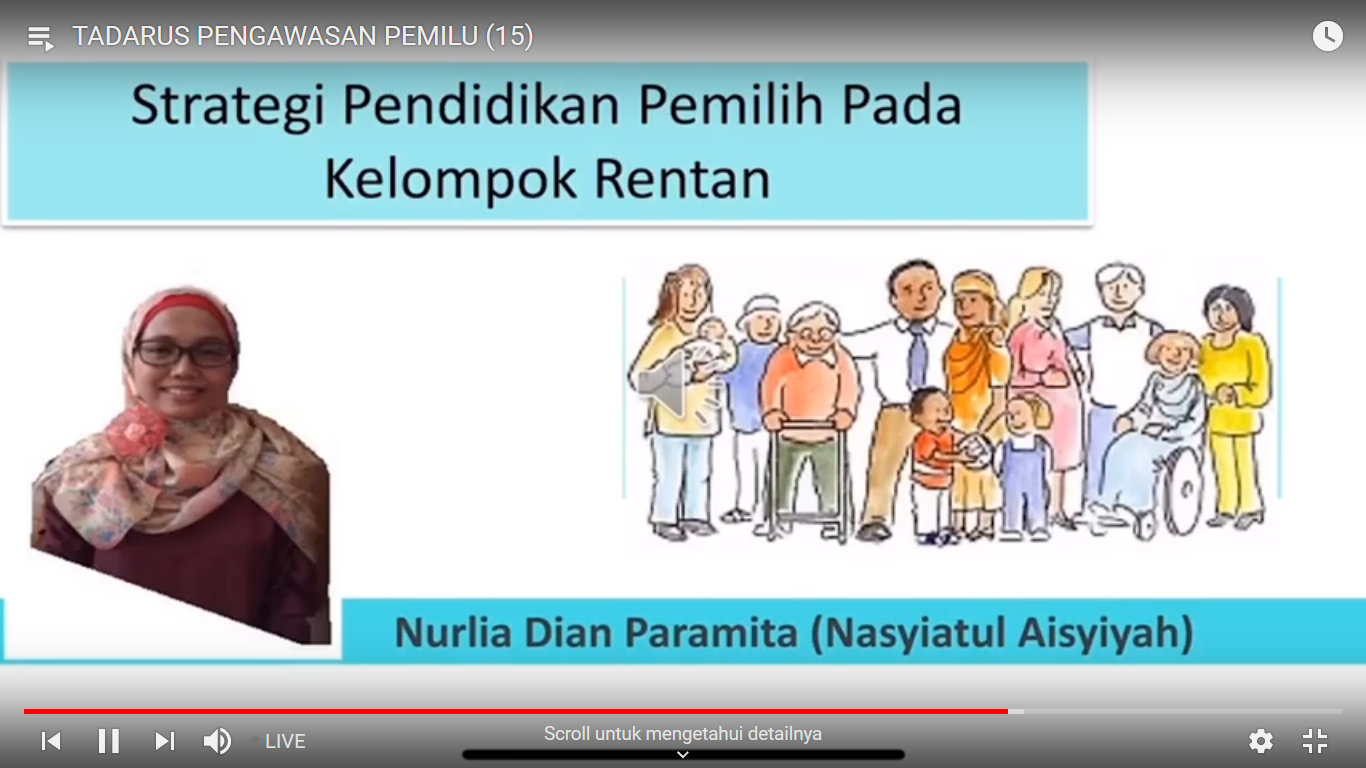 Kota Kediri. Bawaslu Kota Kediri masih mengikuti Tadarus Pengawasan Pemilu. Kali ini materi ke-15 mengangkat topik Strategi Pendidikan Pemilih pada Kelompok Rentan oleh Nurlia Dian Paramitha (Nasyiatul Aisyiyah) yang ditayangkan secara live melalui Youtube pada tanggal 11 Mei 2020.Kelompok rentan kadang kurang mendapatkan perhatian oleh sebagian penyelenggara Pemilu. Di antara mereka adalah pengungsi, pekerja migran, perempuan, penyandang disabilitas, pemilih pemula, masyarakat adat dan orang yang memiliki masalah administrasi kependudukan.Meraka pada dasarnya mempunyai hak yang sama untuk memilih, mengawasi maupun dipilih. Maka dari itu perlu diberikan pendidikan dan pengetahuan tentang kepemiluan. Adapun beberapa strategi pemberian pendidikan kepada pemilih dengan talkshow radio, televisi, diskusi daring, pengajian, kegiatan keagamaan, mobil keliling, seminar, KKN tematik, magang, sosialisasi,