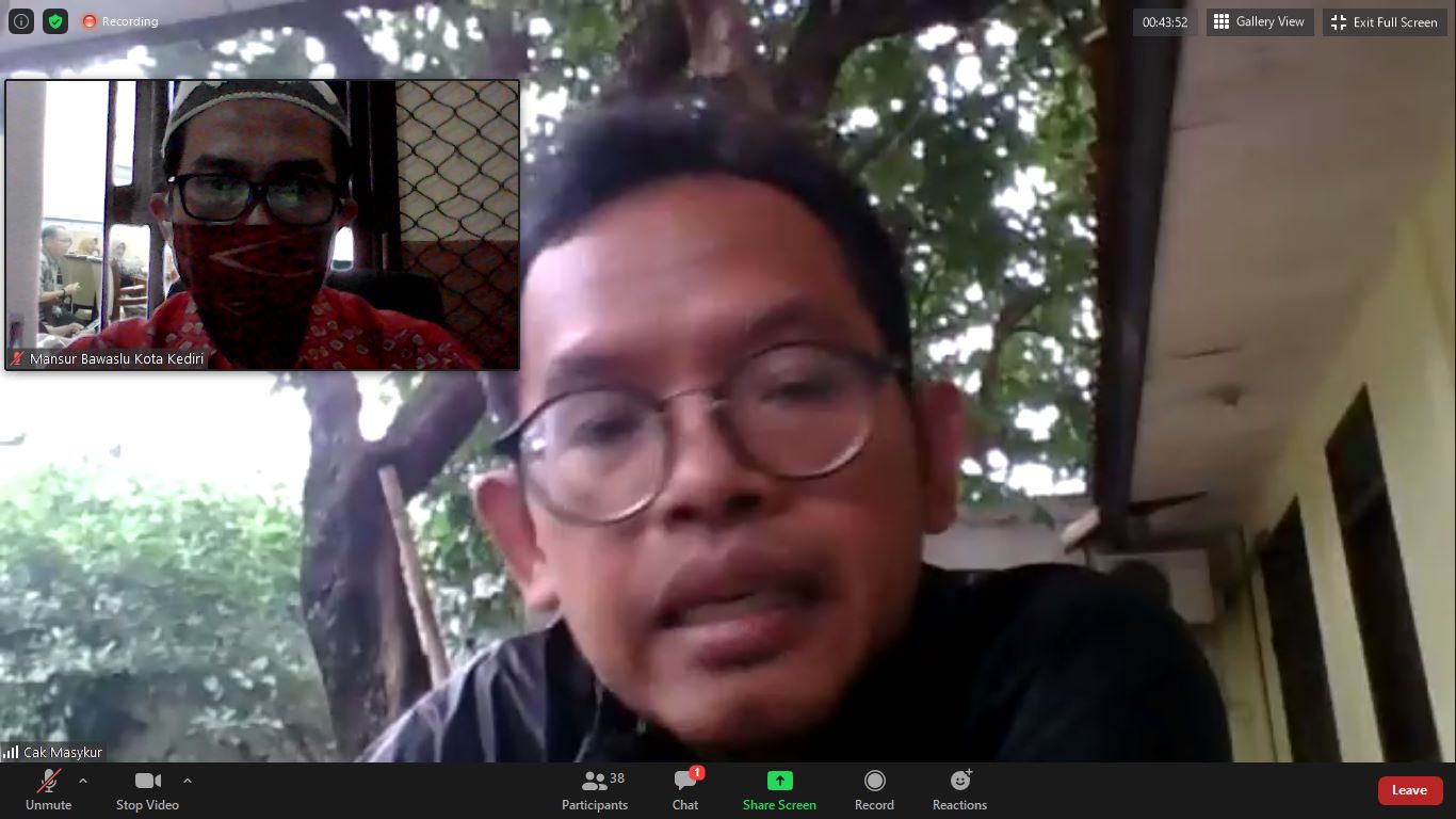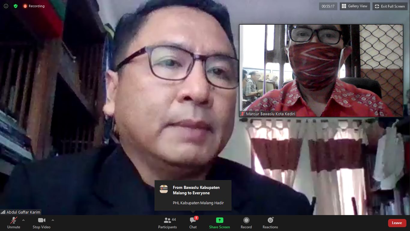 Kota Kediri. Kordiv PHL Bawaslu Kota Kediri menghadiri secara virtual melalui Zoom undangan Sosialisasi Riset Evaluasi Pelaksanaan Pilkada Serentak di Indonesia dari Bawaslu RI pada tanggal 2 Juli 2020 mulai pukul 11.00 WIB. Dalam acara ini Bawaslu Jawa Timur dan jajaran di bawahnya ditanya tentang kesiapan riset evaluasi pelaksanaan Pilkada serentak sejak 2015 hingga 2018 ditambah tahapan Pilkada 2020 di masa pandemi. Cak Masykur, Tenaga Ahli Bawaslu RI memberikan arahan bahwa Bawaslu bukan hanya menerbitkan surat rekomendasi, putusan ataupun Berita Acara, tetapi seharusnya dapat juga menerbitkan suatu tulisan ilmiah berupa buku hasil penelitian dalam Pilkada. Dalam penelitian ini Bawaslu Jawa Timur didampingi oleh dosen UGM, Abdul Gaffar Karim yang akan memberikan arahan dan bimbingan dalam penelitian dan penyusunan buku tersebut.Mansur, Kordiv PHL Bawaslu Kota Kediri telah menyiapkan bahan penelitian ini dengan obyek DPT Pilkada 2018, khususnya untuk TPS 20 Kelurahan Ngronggo.