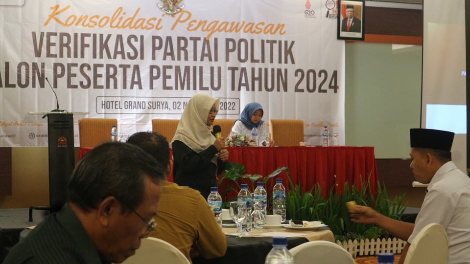 Selanjutnya, untuk materi ke dua disampaikan oleh Anggota KPU Kota Kediri Nia Sari selaku Divisi Teknis Penyelenggara. Dalam hal ini beliau menyampaikan Verifikasi partai Politik Peserta Pemilu 2024. Adapun tahap atau proses yang ada dalam pendaftaran parpol ini yakni pengumuman pendaftaran perpol kemudian tahap pendaftaran, pelaksanaan verifikasi administrasi kemudian penyampaian verifikasi administrasi, perbaikan dokumen persyaratan oleh parpol, tahap verifikasi administrasi perbaikan kemudian penyampaian dan pengumuman rekapitulasi hasil verifikasi administrasi kemudian tahap verifikasi faktual dimana tahap ini sedang berlangsung. Dilanjutkan dengan penyampaian hasil verifikasi faktual kemudian perbaikan dokumen persyaratan oleh parpol kemudian verifikasi faktual perbaikan dilanjutkan penetapan partai politik peserta pemilu, kemudian pengundian dan penetapan nomor urut dan yang terakhir pengumuman partai politik peserta pemilu.