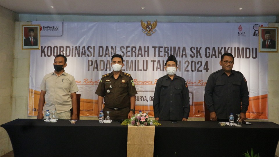 Kota Kediri, 08 Nopember 2022. Bawaslu Kota Kediri melakukan Koordinasi dan Serah Terima SK Gakkumdu pada Pemilu Tahun 2024. Koordinasi dilaksanakan bersama Anggota Sentra Penegakan Hukum Terpadu (Gakkumdu) seperti Kepolisian dan Kejaksaaan Negeri Kota Kediri dalam rangka menghadapi Tahapan Pemilihan Umum (Pemilu) serentak tahun 2024 dan ikut terundang KPU Kota Kediri, Kepala Kantor Kesbangpol Kota Kediri, Camat se-Kota Kediri dan Anggota Panwascam. Kegiatan ini dibuka secara resmi oleh Mansur, selaku Ketua Bawaslu Kota Kediri.