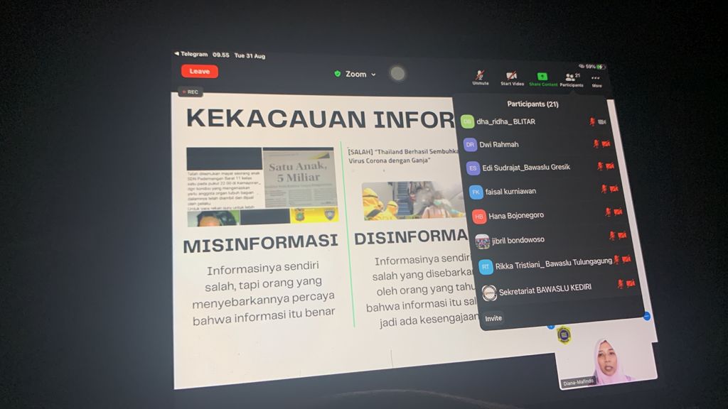 Kota Kediri, 31 Agustus 2021. Bawaslu kota Kediri, mengikuti Literasi Digital Kepemiluan secara virtual yang diadakan oleh Badan Pengawas Pemilu (Bawaslu) Jawa Timur bersama Dinas Komumikasi dan Informasi dan Ciber Literasi mengadakan kegiatan Literasi Digital Kepemiluan kepada perwakilan pelajar di Kabupaten Pamekasan, di Aula Hotel Odaita