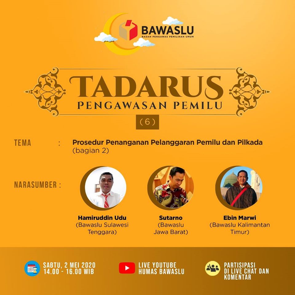 Kota Kediri. Sabtu, 2 Mei 2020, Kordiv PHL Bawaslu Kota Kediri setia mengikuti Tadarus Pengawasan Pemilu yang ditayangkan live di Youtube, kali ini mangangkat topik Penanganan Pelanggaran Pidana dan Kode Etik Pemilihan yang disampaikan oleh 3 narasumber, yaitu Hamiruddin Udu (Bawaslu Sulawesi Tenggara), Sutarno (Bawaslu Jawa Barat) dan Ebin Marwi (Bawaslu Kalimantan Timur).