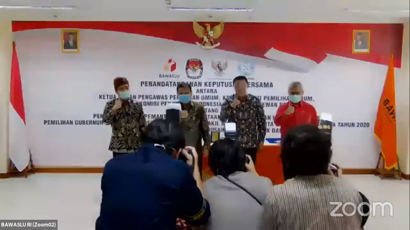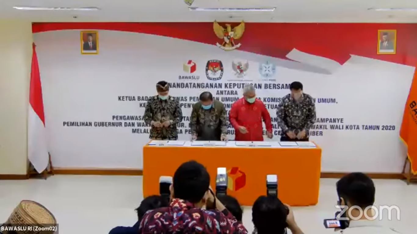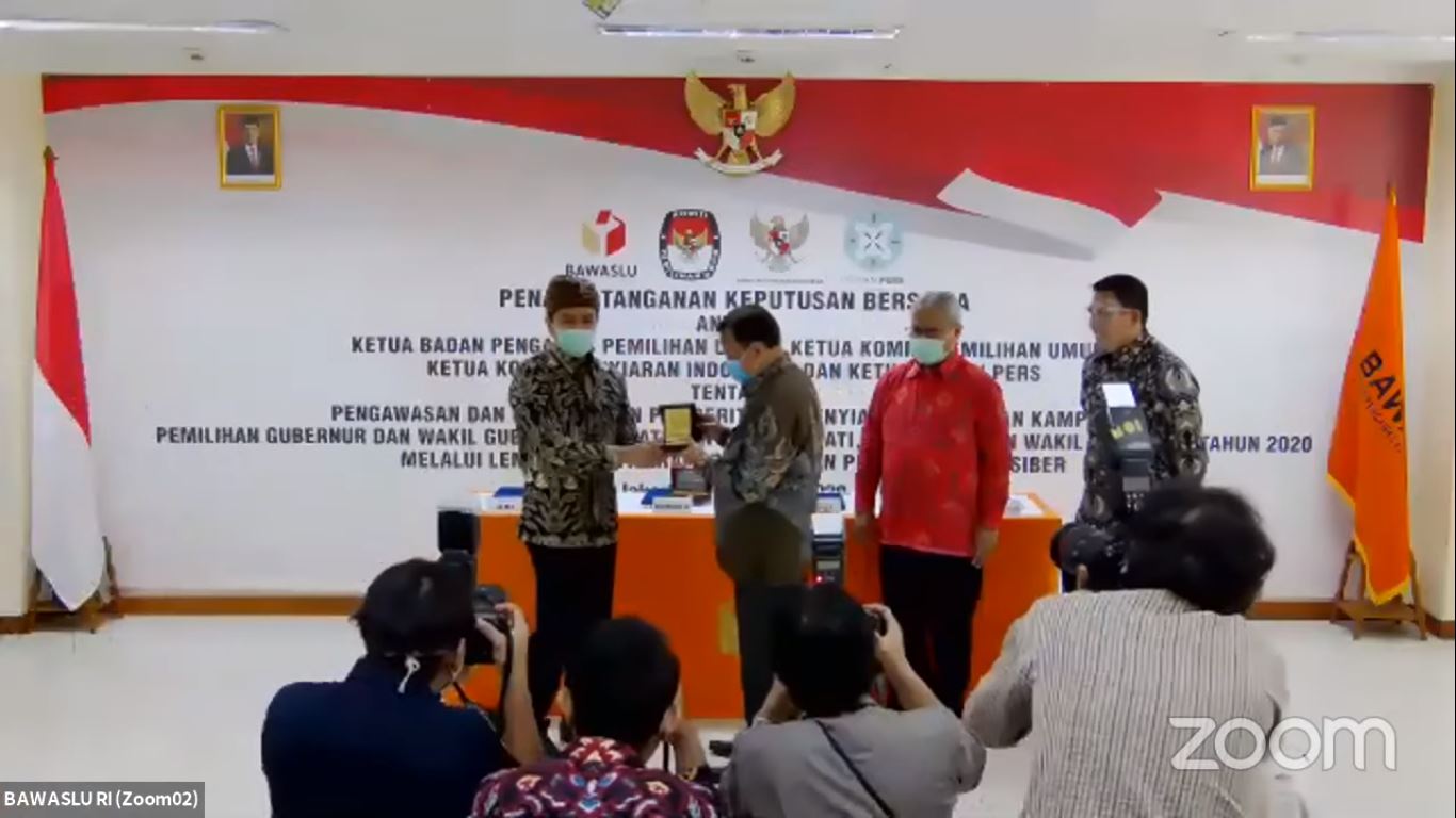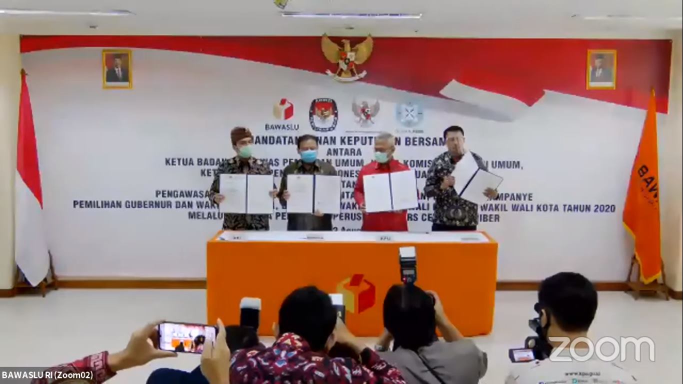 Kota Kediri. Bawaslu melakukan penandatanganan Keputusan Bersama dengan KPU, KPI, dan Dewan Pers di Lantai 4 Gedung Bawaslu RI, Rabu (12/8/2020). Keputusan Bersama ini berisi tentang Pengawasan dan Pemantauan Pemberitaan, Penyiaran, dan Kampanye. Tujuan penandatanganan ini, Bawaslu yang menginisiasi acara ini untuk mencegah sejak dini pelanggaran dalam tahapan kampanye, baik pemberitaan, penyiaran pengiklanan maupun lainnya yang dilakukan oleh peserta Pilkada, media cetak maupun elektronik.Rangkaian acara ini diawali dengan penandatanganan Keputusan Bersama, dilanjutkan dengan tukar menukar cendera mata oleh masing-masing lembaga, dan foto bersama dengan gaya salam masing-masing lembaga.