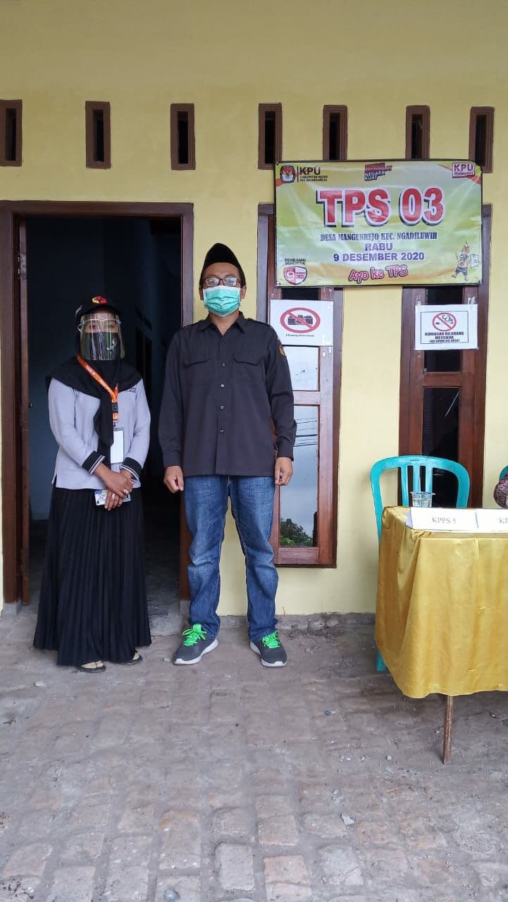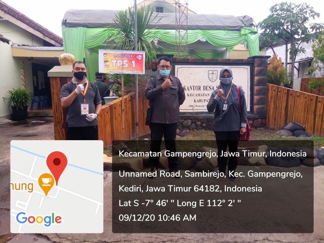 Pada pukul 11.00 WIB melakukan monitoring di TPS 1 desa Sambirejo, Kecamatan Kandat berjalan kondusif dan sesuai protokol Covid-19. Ada 1 yang janggal tapi tidak bisa diduga sebagai sebuah pelanggaran. Ada relawan PKH yang ditugaskan untuk merekap pemilih yang terdaftar PKH untuk laporan setelah nyoblos.Sementara itu, Yusron melakukan monitoring di TPS 03 desa Mangunrejo kec. Ngadiluwih kab. Kediri