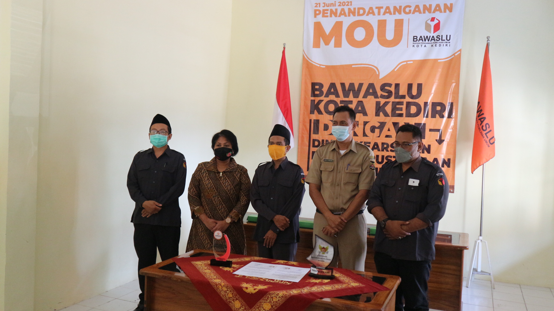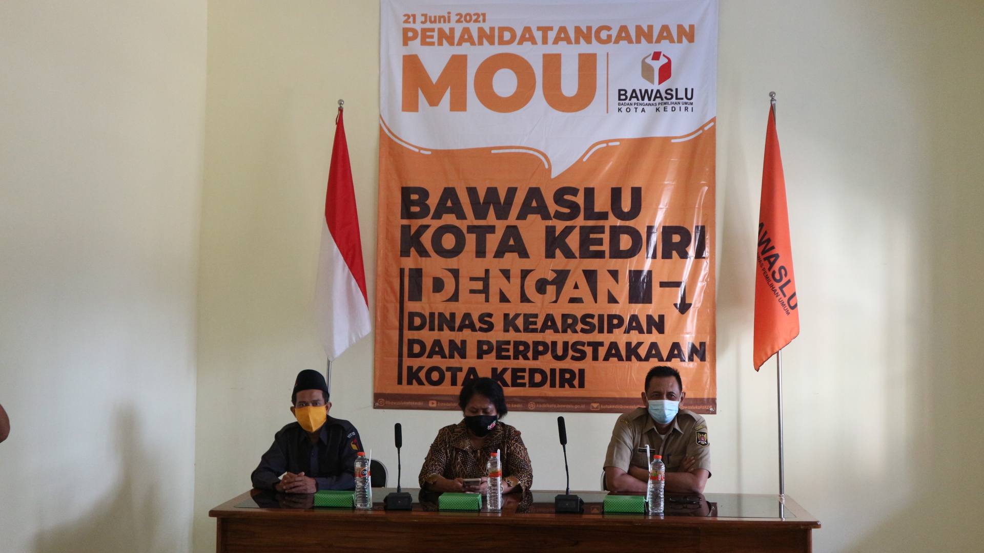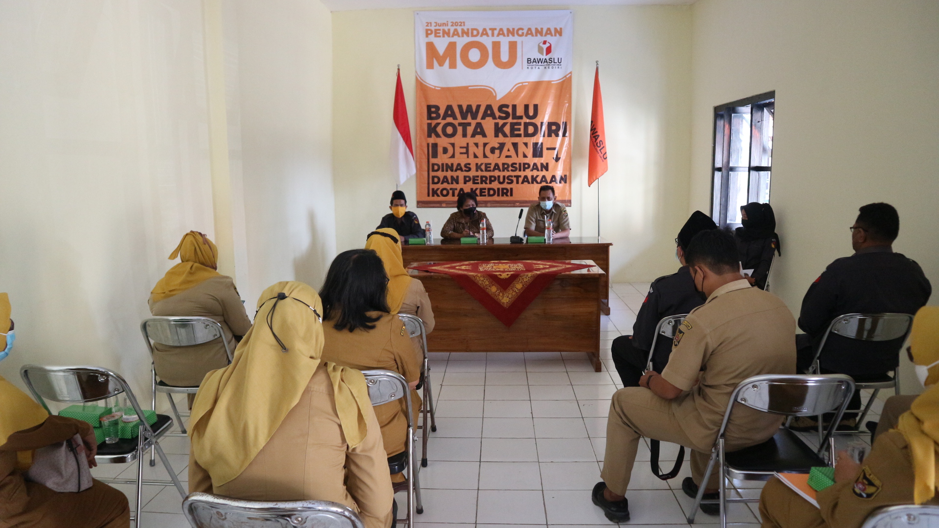 Kota Kediri, 21 Juni 2021. Bawaslu Kota Kediri melakukan perjanjian kerja sama atau MoU bersama Dinas Kearsipan dan Perpustakaan Kota Kediri di Aula Kantor Kesbangpol yang dimulai pukul 09.15 WIB. Acara ini dihadiri oleh Kepala Dinas Kearsipan dan Perpustakaan Kota Kediri Drs. Hery Purnomo, Eka Rahmawati selaku Anggota Bawaslu Provinsi Jawa Timur Divisi Organisasi sekaligus jajaran pegawai kearsipan Kota Kediri.