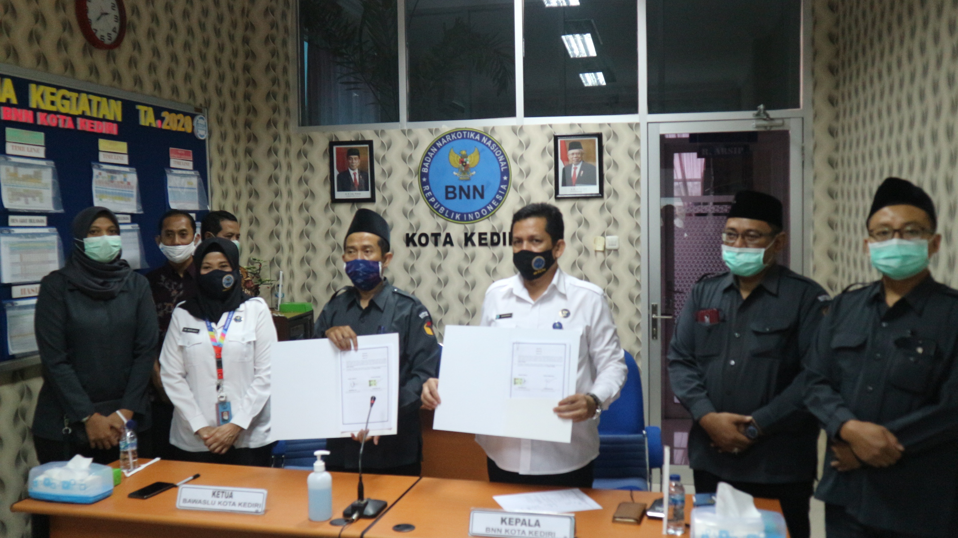 Kota Kediri, Rabu 12 Agustus 2020. Ketua Bawaslu Kota Kediri beserta anggota dan Koordinator Sekretariat Bawaslu Kota Kediri melakukan penandatangan kerja sama dengan Badan Narkotika Nasional (BNN) Kota Kediri. Acara ini dimulai pada pukul 14.00 WIB. Acara ini disambut sekaligus dibuka oleh Ketua Bawaslu Provinsi Jawa Timur Bapak Moh. Amin. Pelaksanaan perjanjian dimulai dari Bawaslu Provinsi Jawa Timur. Perjanjian ini bertujuan untuk menjaga seluruh petugas pengawas pemilu terbebas dari narkotika, mulai pengawas pemilu tingkat atas sampai tingkat TPS. Kemudian sambutan selanjutnya oleh BNN Provinsi Jawa Timur yang disampaikan oleh Kepala BNN Provinsi Jawa Timur Bapak Bambang Priyambadha, dengan adanya nota kesepakatan antara BNN Pusat dan Bawaslu RI diharapkan seluruh jajaran dari atas hingga tingkat yang ada di TPS bisa benar-benar terbebas dari narkotika.
