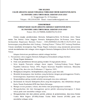 PENGUMUMAN SELEKSI CALON PANWAS KAB/KOTA SE - JATIM MASA JABATAN 2018 - 2023 humas | Selasa, April 9, 2019 - 10:30 Tag PENGUMUMAN Share Berita Terkini humas Senin, Januari 5, 2026 - 11:39 Tingkatkan Kinerja Pasca WFA, Bawaslu Kota Kediri Tekankan Integritas dan Efisiensi humas Senin, Desember 22, 2025 - 14:14 Bawaslu Kota Kediri Susun Rencana Tindak Lanjut Kader Pengawas Partisipatif humas Sabtu, Desember 20, 2025 - 19:58 Bawaslu Provinsi Jawa Timur Raih Penghargaan Terbaik 1 Konten Terpopuler se-Indonesia Lihat Lainnya