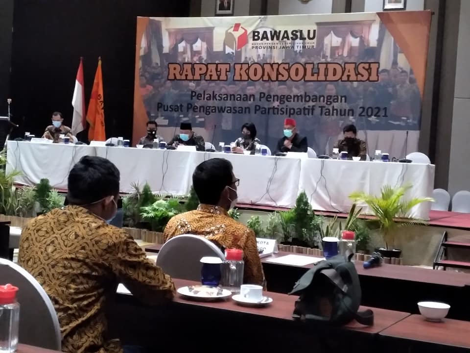 Gresik. Koordinator Divisi Pengawasan Hubungan Masyarakat dan Hubungan Antar Lembaga Bawaslu Kota Kediri, Mansur menghadiri Rapat Konsolidasi Pelaksanaan Pengembangan Pusat Pengawasan Partisipatif Tahun 2021 yang diselenggarakan oleh Bawaslu Jawa Timur di Hotel Aston Inn Gresik pada 22 Februari 2021.Konsolidasi ini dilaksanakan untuk peningkatan partisipasi masyarakat dalam pengawasan pemilu yang semakin masif untuk mempersiapkan Pemilu yang akan datang pada tahun 2024, yaitu Pemilihan Presiden, Legislatif dan Pilkada. Hal ini disampaikan oleh Aang Kunaifi, Anggota Bawaslu Jawa Timur dalam sambutannya pada acara tersebut. Dalam konsolidasi ini juga dihadiri Ketua Bawaslu Jatim, Muhammad Amin yang sekaligus membuka acara ini, juga dihadiri oleh Totok Hariono dan Eka Rahmawati, Anggota Bawaslu Jawa Timur. Narasumber dalam acara ini, Dr. Muhammad Zamroni, SH, M.Hum, Dekan Fakultas Hukum Universitas Ma'arif Hasyim Latif Sidoarjo dan Dr. Abdul Chalik, MA, Dosen UINSA Surabaya serta dihadiri oleh Kordiv PHL Bawaslu Kabupaten/ Kota se-Jawa Timur dan perwakilan beberapa lembaga dan organisasi yang berkompeten dalam pemilu se-Jawa Timur.