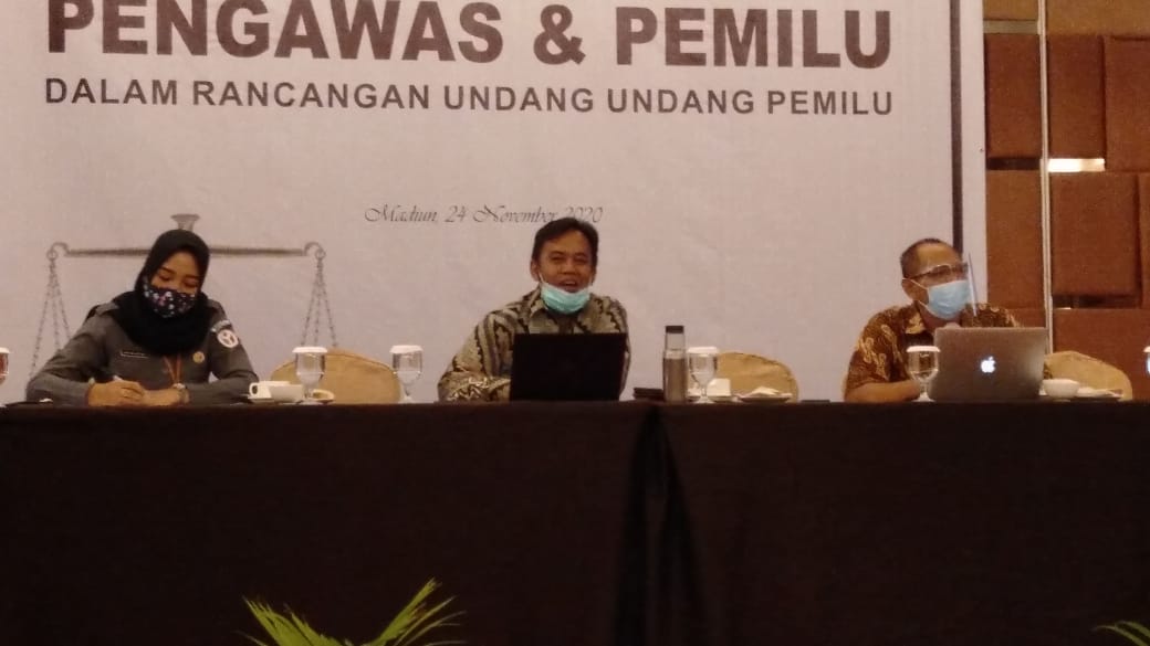Madiun, 24 November 2020. Ketua Bawaslu Kota Kediri beserta Anggota menghadiri undangan Bawaslu Provinsi Jawa Timur dalam kegiatan Sosialisasi dengan tema “Pengawas dan Pemilu Dalam Rancangan Undang-Undang Pemilu” di Ruang Bima Hotel Aston Madiun. Kegiatan ini dihadiri oleh Bawaslu Kabupaten/Kota terundang antara lain: Bawaslu Kabupaten Jombang, Bawaslu Kabupaten Nganjuk, Bawaslu Kabupaten Magetan, Bawaslu Kota Mojokerto, Bawaslu Kota Madiun serta Bawaslu Kota Kediri. Kegiatan ini dimulai pukul 09.WIB. Purnomo Satrio Pringgodigdo, Anggota Bawaslu Provinsi Jawa Timur menyampaikan dalam RUU PEMILU, BAWASLU Kabupaten/ Kota masih permanent dan masih berjumlah 3/5 sesuai besar jumlah besar kecilnya penduduk, luas daerah dan wilayah administrasi. Kewajiban Bawaslu Kabupaten/ Kota berkewajiban mengembangkan Pengawasan partisipatif. Kewenangan Bawaslu Kabupaten/ Kota dalam penyelesaian pelanggaran administratif kembali mengeluarkan rekomendasi, bukan sidang ajudikasi lagi.