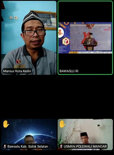 Kota Kediri, 09 April 2022. Bawaslu Kota Kediri mengikuti acara Peringatan Hari Lahir Ke-14 Tahun Bawaslu Mengawasi oleh Bawaslu RI yang dilaksanakan secara daring pada pukul 10.00 WIB yang diikuti oleh Ketua beserta Anggota Bawaslu Provinsi dan Kabupaten/Kota seluruh Indonesia sekaligus Kasek dan Korsek Bawaslu Provinsi dan Kabupaten/Kota seluruh Indonesia.