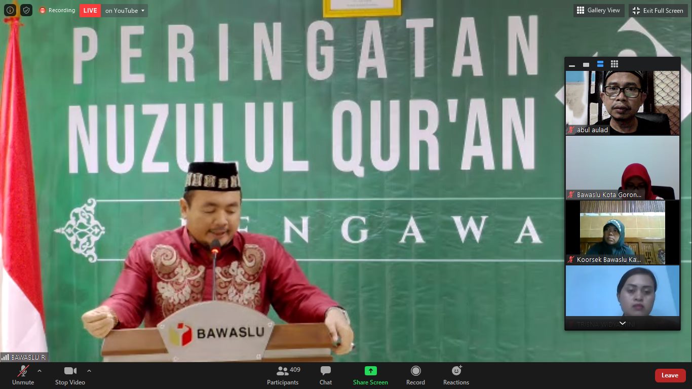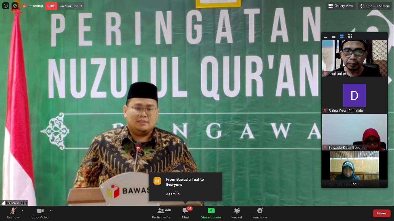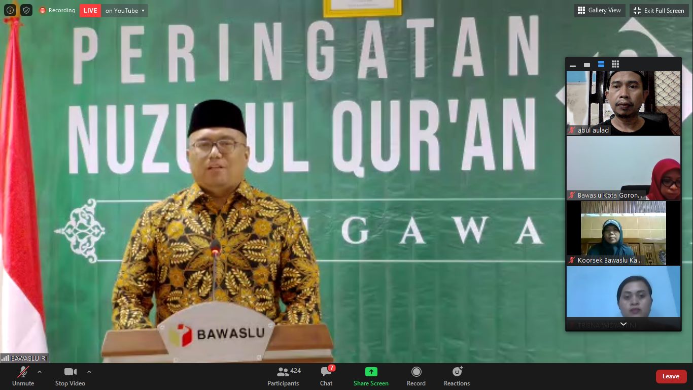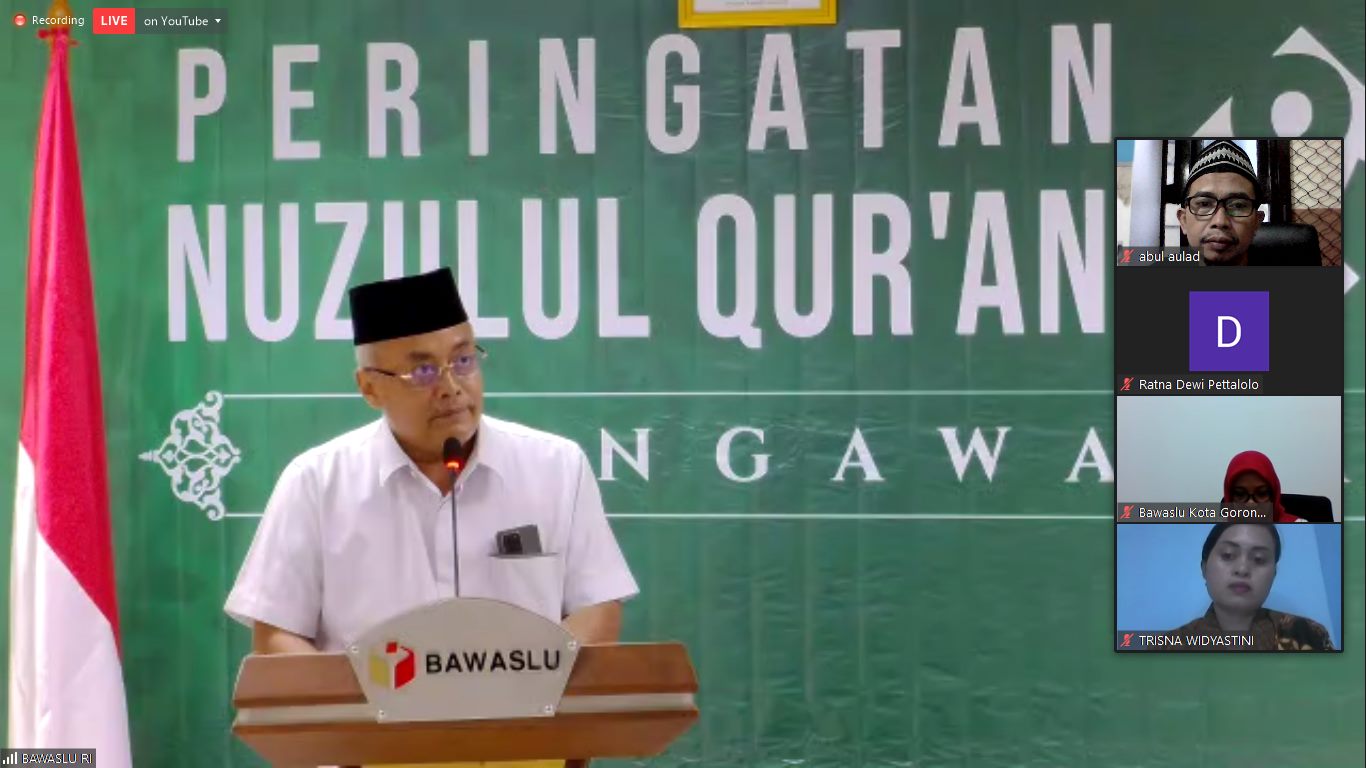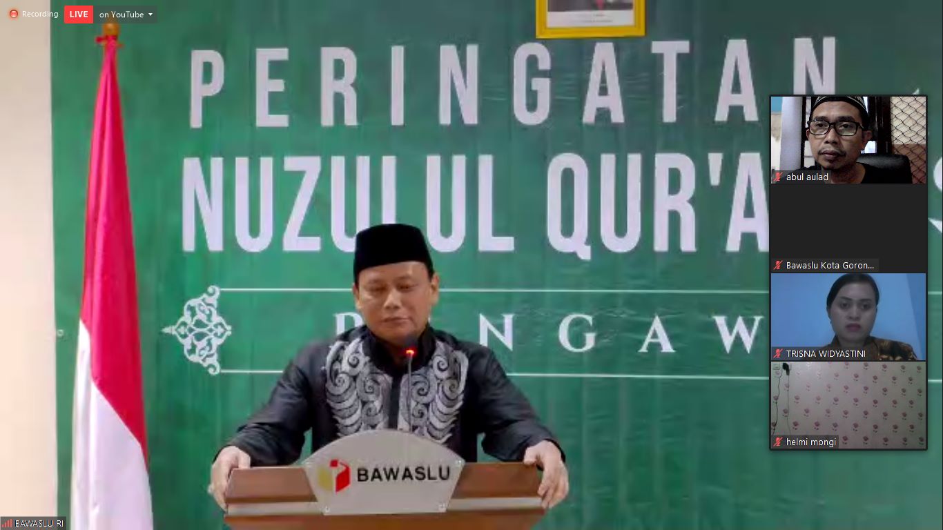 Kota Kediri. Rabu, 20 Mei 2020, Bawaslu Republik Indonesia mengadakan peringatan Nuzulul Qur'an dan Khataman Tadarus Pengawasan Pemilu meskipun tadarus dilaksanakan sampai akhir Ramadhan. Bawaslu Kota Kediri menjadi salah satu peserta, mengikuti dari aplikasi Zoom. Dalam acara ini sambutan pembuka oleh Moh. Afifuddin, inisiator Tadarus Pengawasan Pemilu dan ditutup oleh Abhan, Ketua Bawaslu RI, di sela-sela sambutan beliau berdua, Anggota Bawaslu RI yang lain dan Sekjen juga memberikan sambutan.Afif menyampaikan bahwa Surat Al Alaq yang pertama kali diturunkan kepada Nabi Muhammad, mengajarkan bahwa kita harus terus belajar, membaca dan meningkatkan kapasitas, termasuk dalam pengawasan Pemilu.Abhan yang mengutip ayat dari Surat Al Baqoroh tentang Bulan Ramadhan dan turunnya Al Qur'an, menyampaikan bahwa di Ramadhan yang mulia ini, kita tingkatkan kinerja pengawasan kita dalam mengawal Pemilu dan Pilkada.Dalam sambutannya