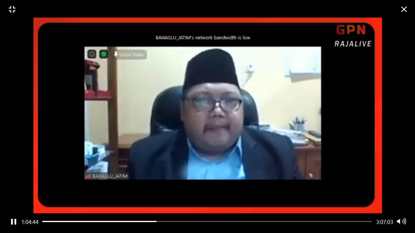 Kota Kediri. Muhammad Amin, Ketua Bawaslu Jawa Timur menjadi salah satu narasumber pada kegiatan Webinar yang diselenggarakan oleh DPD GPN Kabupaten Tuban dengan mengangkat tema Money Politik sebagai Ancaman Demokrasi pada 15 Juli 2020 mulai pukul 20.00 WIB.