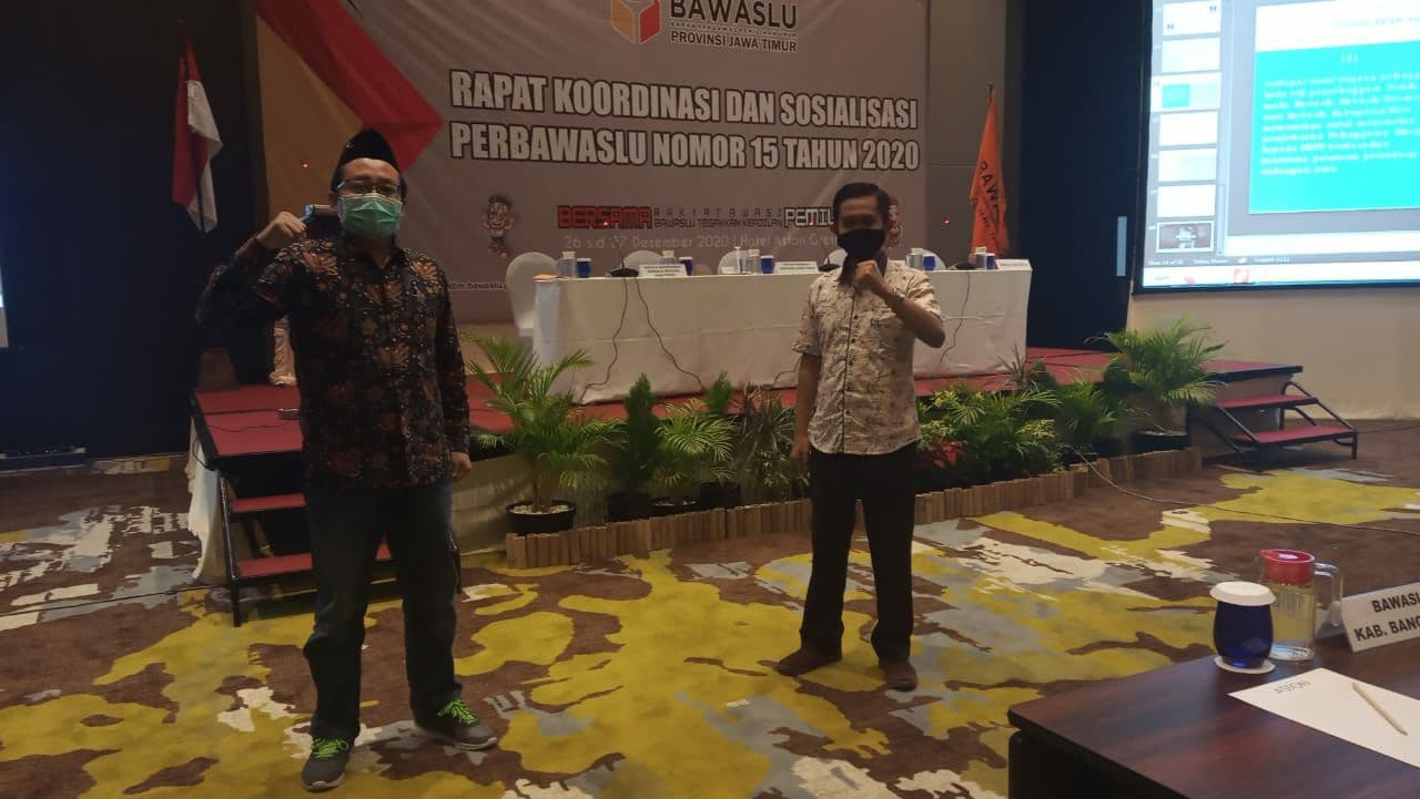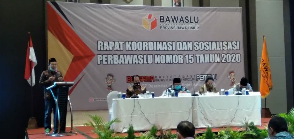 Bawaslu Kota Kediri menghadiri undangan Bawaslu Provinsi Jawa Timur dalam acara Rapat Koordinasi dan Sosialisasi Perbawaslu Tahun 2020 tersebut kepada Badan Pengawas Pemilihan Umum Kabupaten/Kota se – Jawa Timur. Acara ini dihadiri oleh 38 Bawaslu Kabupaten/Kota dan bertempat di Hotel Aston Gresik pada hari Sabtu, 26 Desember 2020. Kegiatan diawali dengan pembagian Petunjuk Operasional Kegiatan (POK) yang dibagikan secara langsung oleh Bapak Sapni Syahril, S.IP., M.Si. yang menjabat sebagai Kepala Sekretariat Bawaslu Provinsi Jawa Timur. Selanjutnya telah hadir sebagai pemateri yaitu Bapak Moh. Amin (Ketua Bawaslu Provinsi Jawa Timur) dan Ibu Eka Rahmawati (Koordinator Divisi Organisasi Bawaslu Provinsi Jawa Timur). Dalam hal penyampaian kedua pemateri tersebut, dapat ditarik kesimpulan yakni, pelaksanaan pembinaan dan pengawasan terhadap pelaksanaan tugas pengawasan Pemilu, rancangan Perbawaslu Tentang Tata Cara Pembinaan Dan Pengawasan Terhadap Pelaksanaan Tugas Pengawas Pemilihan Umum guna meningkatkan kualitas dan akuntabilitas kinerja serta untuk menciptakan pelaksanaan tugas yang terkoordinasi dan bertanggung jawab. Terkait kewajiban, pelaksanaan kewajiban Bawaslu, Bawaslu Provinsi, Bawaslu Kabupaten/Kota, Panwaslu Kecamatan, Panwaslu Kelurahan/Desa untuk melakukan pembinaan dan pengawasan terhadap pelaksanaan tugas Pengawas Pemilihan Umum pada tingkatan di bawahnya. Ketentuan pembinaan ada didalam Perbawaslu Nomor 15 Tahun 2020 Pasal 5 ayat (1). Tujuan pembinaan adalah meningkatkan kapasitas pengawas pemilu, mengawasi kinerja pengawas pemilu dan menyelesaikan pelanggaran kinerja pengawas Pemilu.