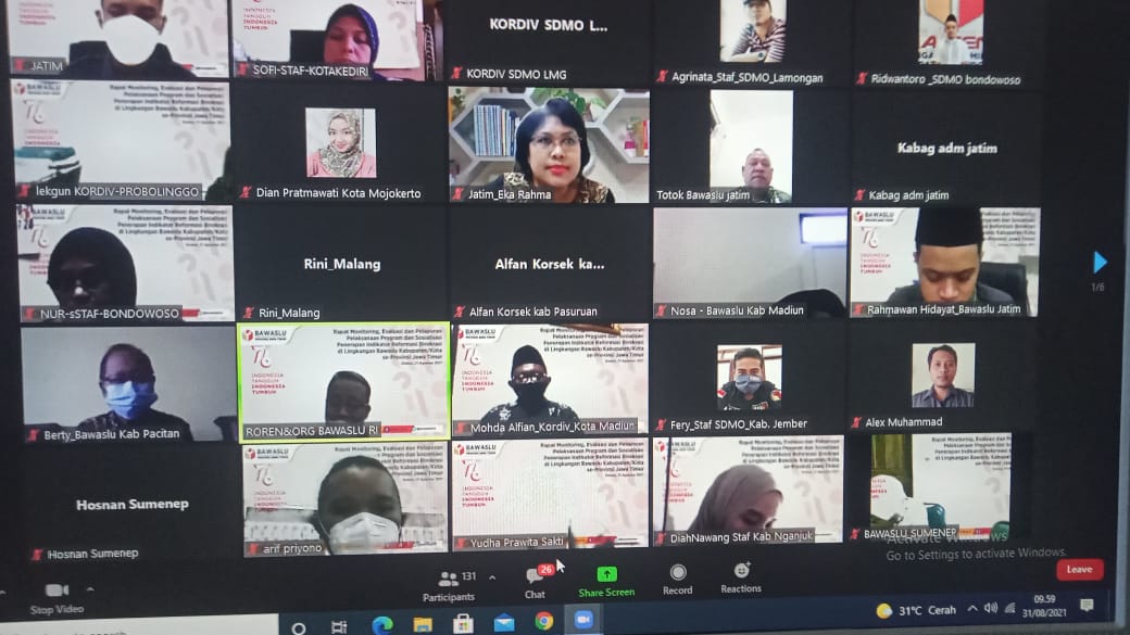Kota Kediri, 31 September 2021. Bawaslu Kota Kediri mengikuti kegiatan “Rapat Monitoring, Evaluasi dan Pelaporan Pelaksanaan Program dan Sosialisasi Penerapan Indikator Reformasi Birokrasi di Lingkungan Badan pengawas Pemilu Kabupaten/Kota se-Provinsi Jawa Timur” secara virtual oleh Bawaslu Provinsi Jawa Timur. Peserta Kegiatan terdiri dari : Kordiv SDMO, Kasek/Korsek & staf SDMO Kabupaten/Kota se-Jawa Timur. Acara dimulai pukul : 09.24 WIB.