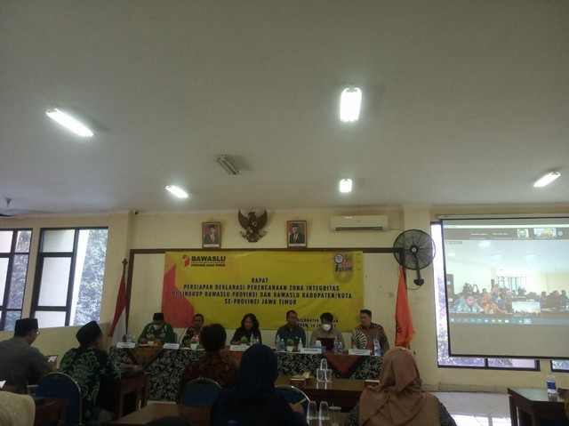Kabupaten Pasuruan, 14 Juli 2022. Kordiv SDMO Datin Bawaslu Kota Kediri, Yusron Khoirul Anam menghadiri undangan Rapat Persiapan Deklarasi Pencanangan Zona Integritas di Lingkup Bawaslu Provinsi dan Bawaslu Kab/Kota se - Jawa Timur yang dilaksanakan di Kantor Kecamatan Pandaan Kabupaten Pasuruan pada pukul 09.00 WIB. Kegiatan ini dihadiri oleh Kordiv Organisasi Bawaslu Provinsi Jawa Timur, Eka Rahmawati sekaligus membuka acara beserta Kepala Bagian Administrasi Bawaslu Provinsi Jawa Timur, Tri Adiyanto Baay. Dalam sambutannya, Eka Rahmawati menyampaikan agenda hari ini merupakan tindak lanjut agenda tahun lalu terkait WBBM dan WBK. Dan untuk dipersiapkan sepuluh Kabupaten/Kota Provinsi Jawa Timur dijadikan sebagai kawasan Zona Integritas.