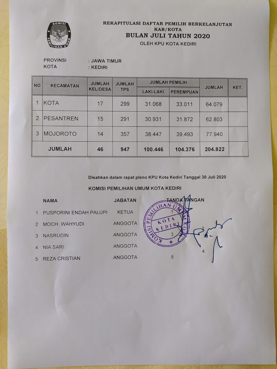 Berikut rekapitulasi daftar pemilih berkelanjutan bulan Juli tahun 2020 oleh KPU Kota Kediri :