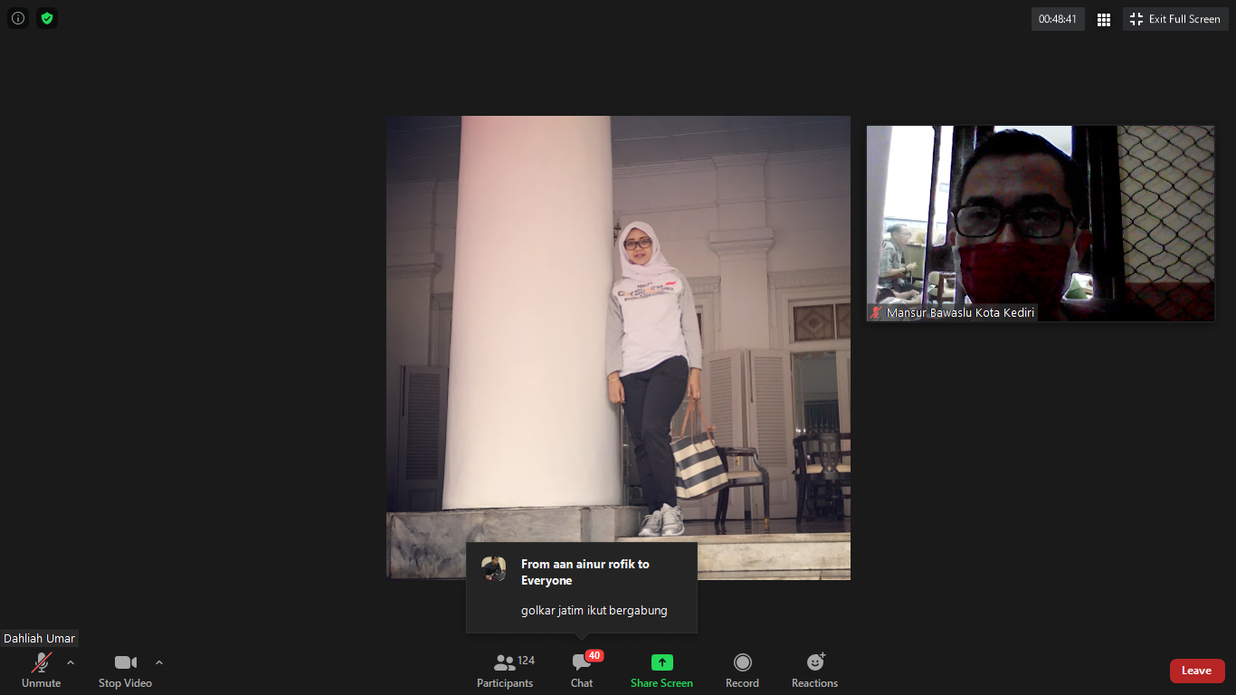 Kota Kediri. NETFID Jawa Timur menyelenggarakan Webinar Nasional dengan mengambil tema "Tantangan Penyelenggaraan Pilkada 2020 di Masa Pandemi Covid-19" pada Sabtu, 18 Juli 2020 mulai pukul 10.00 WIB. Bawaslu Kota Kediri mengikutinya melalui Zoom. Dahlia Umar, Ketua NETFID Indonesia berkenan memberikan sambutannya.