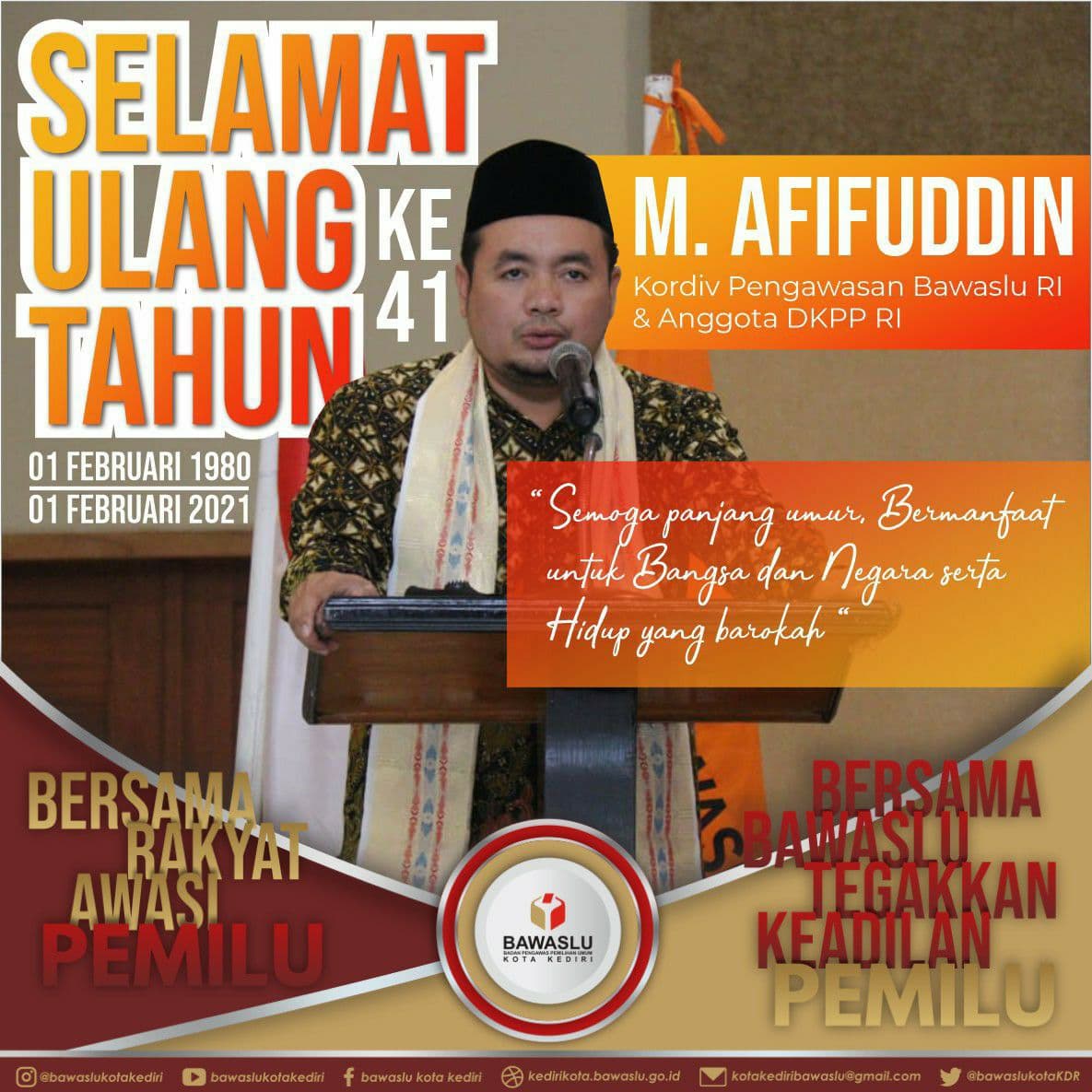Selamat Ulang Tahun Bapak M. Afifuddin yang ke 41. Semoga panjang umur, bermanfaat untuk Bangsa dan Negara serta hidup yang barokah humas | Senin, Februari 1, 2021 - 10:39 Tag PENGUMUMAN Share Berita Terkini humas Rabu, April 22, 2026 - 12:36 Bawaslu Kota Kediri Lakukan Uji Petik di Ngadirejo: Temukan Pemilih TMS Meninggal Dunia dan Pemilih Baru humas Kamis, April 16, 2026 - 12:55 Kawal Pemutakhiran Data Pemilih, Bawaslu Kota Kediri Koordinasi ke Kelurahan Bandar Kidul humas Senin, April 13, 2026 - 08:34 Persiapan Supervisi Provinsi dan Penguatan Internal, Bawaslu Kota Kediri Gelar Apel Pagi Lihat Lainnya