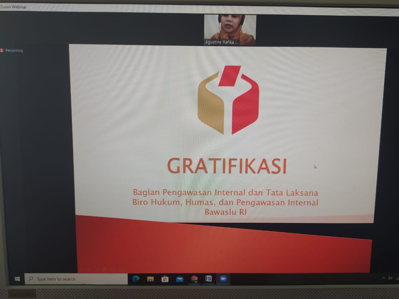 Ibu Agustin Rafikasari menjelaskan tentang gratifikasi secara umum dan pengendaliannya berdasarkan Perbawaslu No. 6 tahun 2015 tentang pengendalian gratifikasi di lingkungan Bawaslu. Gratifikasi merupakan pemberian uang, rabat, komisi, pinjaman tanpa bunga, tiket perjalanan, fasilitas penginapan, perjalanan wisata, pengobatan cuma-cuma dan fasilitas lainnya yang diberikan oleh menggunakan sarana elektronik maupun non elektronik. Hal-hal yang diatur dalam Perbawaslu Gratifikasi meliputi Pencegahan Gratifikasi, Unit Pengendalian Gratifikasi, Tata cara Pelaporan serta perlindungan, penghargaan dan sanksi. Sesuai Perbawaslu no. 6 tahun 2015 pada pasal 3 mewajibkan untuk menolak gratifikasi yang meliputi:
